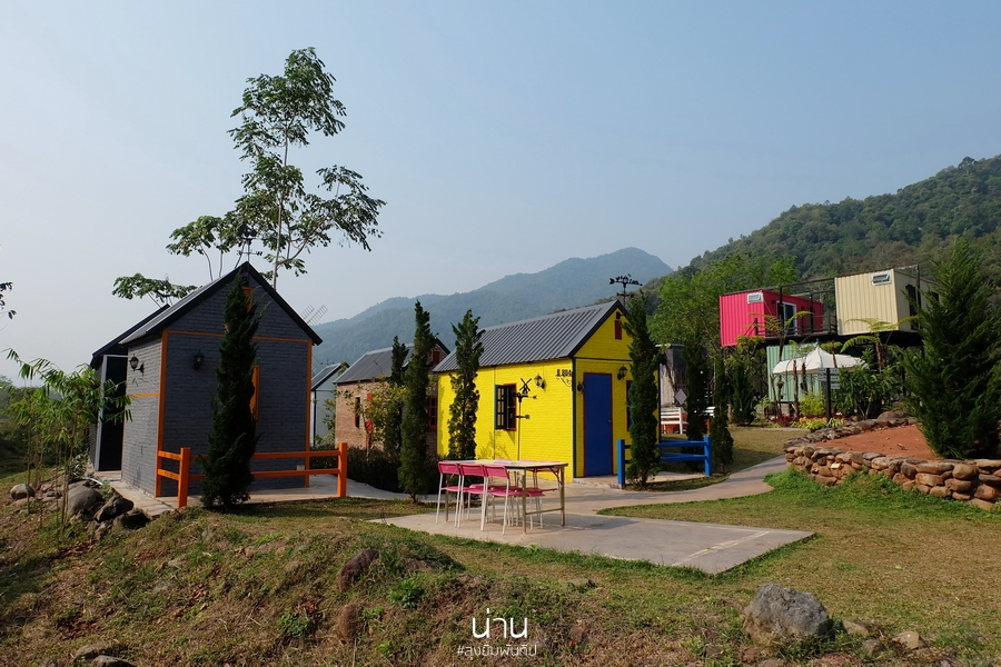 จากอุทยานแห่งชาติดอยภูคา เรื่อยมายังจุดชมวิว จนกระทั่งลงเขามาเจอ 3 แยก ผมเลี้ยวขวาไปตามป้าย "อ. บ่อเกลือ 1 กม." ระหว่างทางมองไปรอบๆ รู้สึกว่าจะเป็นเมืองในที่ราบหุบเขา ที่มีลำน้ำมางไหลผ่าน อากาศเย็นสบายดี เมืองค่อนข้างเล็กครับ ขนาดเซเว่นยังไม่มี ขับเลยมาอีกนิดก็เจอป้าย "ปลายมาง ทางรัก" ที่พักในค่ำคืนนี้ ...“โอ้ว..ว โดน โดนเลย ทั้งบ้านสวยหลากสี ทั้งตู้คอนเทนเนอร์เก๋ๆ ไหนจะมีกังหันลม และยังติดลำธารอีก"