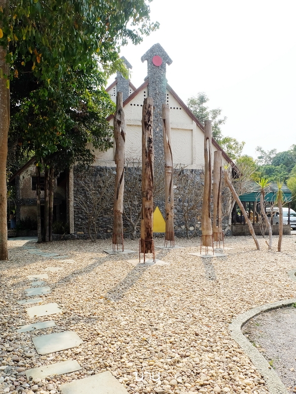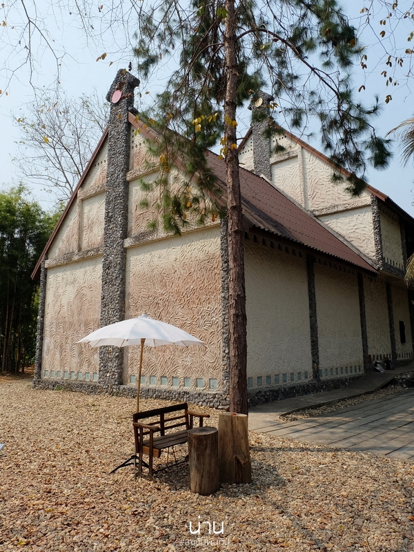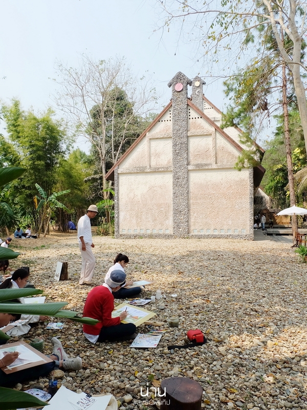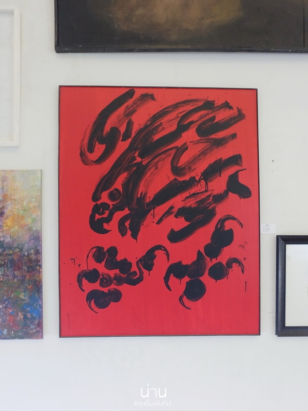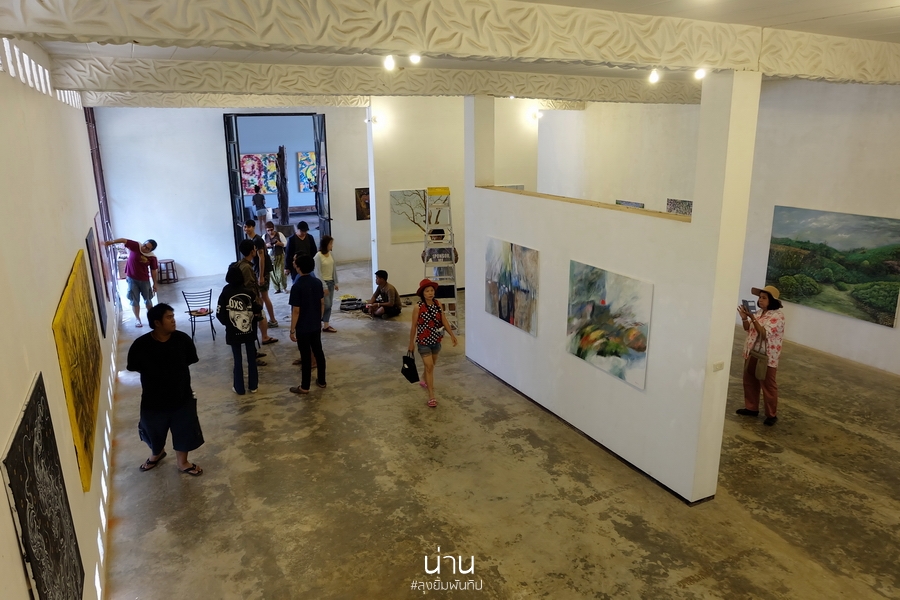 ช่วงสายหลังทานอาหารเช้าที่โรงแรมก็ออกเดินทางไปยังหอศิลป์ริมน่าน ซึ่งอยู่ห่างจากตัวเมืองน่านออกไปประมาณ 20 กม. ค่าเข้าชมคนละ 20.- อาคารหลักลักษณะคล้ายโบสถ์ใหญ่ มี 2 ชั้น จัดแสดงศิลปะหมุนเวียน ขณะที่ผมไปยังมีตอกตะปูแขวนภาพกันอยู่ และที่ชั้นล่างนี้ก็มีผลงานของ อ. ถวัลย์ ดัชนีรวมอยู่ด้วยครับ