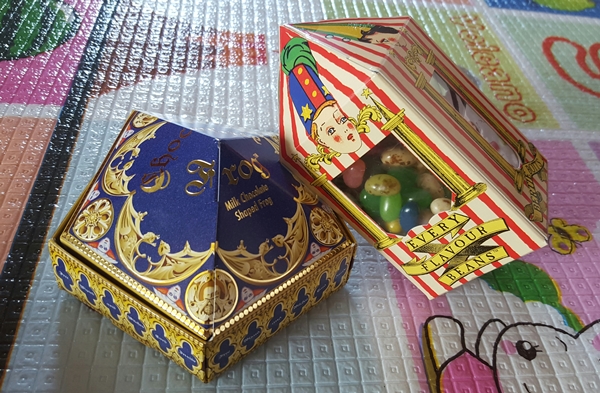 เริ่มจากชิ้นแรก ช็อคโกแลตกบ เนื่องด้วยเป็นบุคคลกลัวกบมาก แค่พูดชื่อก็ร้องไห้ได้ นี่พิมพ์ไปก็มือสั่นไป แต่ด้วยมิตรภาพระหว่างเรากับแฮรี่ เอาวะ ต้องลอง ก่อนเปิดกล่องนี่ก็จินตนาการจะมีกบกระโดดออกมาไหมอะ? เตรียมวิ่งนะ แต่เปิดออกมาไม่มีกบกระโดด มีแค่กบดำๆหนึ่งตัวที่น่ากลัวกว่าสิ่งไหนไหน ~~ เป็น milk chocolate ค่ะ ตอนแรกนึกว่าจะหวานๆน่ะ แต่ไม่เลย ขมๆหน่อยๆ กลมกล่อม ละลายในปาก (อากาศประเทศไทยมันร้อน..ที่จริงละลายตั้งแต่ในมือที่หยิบออกจากถุงได้สองวิละ) ชิมลูกอมแล้วตบท้ายด้วยช็อคคือสิ่งที่ควรทำ เพราะมันจะลบสิ่งเลวร้ายที่ผ่านมาไปได้ ..จริงๆ แต่แอบติดตรงนี่กลัวกบ จะกินทีนี่ต้องให้คนอื่นช่วยตัดมาให้ก่อน อิคนช่วยก็ช่วยเหลือเกิน ตัดมาเป็นชิ้นส่วนยังกับตลาดขายหมู ส่วนขาหน้า ขาหลัง หัว อือฮือออ โหดร้ายมาก ..แต่อร่อยจัง 55