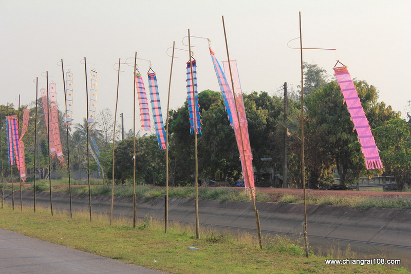 ตุงหลากสีผืนยาว อวดลวดลายวิบวับอยู่บนค้างไม้ไผ่ลำสูง