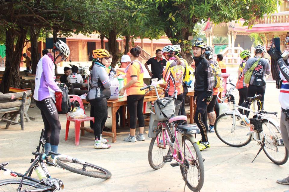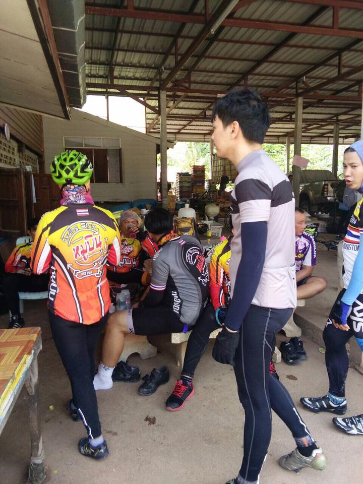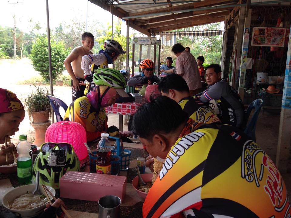 ออกจาก cp1 อากาศเริ่มร้อน เราต้องแวะร้านค้าข้างทางเพื่อเติมน้ำกันอีกรอบ แต่ละคนเริ่มควักยาออกมานวดกล้ามเนื้อที่กำลังอ่อนล้าเพราะเราปั่นมาตั้ง 82 กม.แล้ว ปั่นไปซักพัก เพื่อนในกลุ่มหายจากขบวนไป 3 คน เราต้องหยุดรอเช็คข้อมูลกัน พบว่ามีเพื่อนคนหนึ่งไม่ไหวเลยโบกรถไปรอที่เนินมะปราง ช่วงนั้นความเร็วเราเริ่มดรอปลงแล้ว หลายๆ คนเริ่มหิวเราเลยพักร้านก๋วยเตี๋ยวข้างทาง เนื่องจากกลุ่มเรามีสมาชิกประมาณเกือบ 20 คัน จึงแยกย้ายกันไปกินร้านอาหารตามสั่งบ้าง ถึงอย่างนั้นเราก็เสียเวลาจุดนี้ไปเป็นชั่วโมง