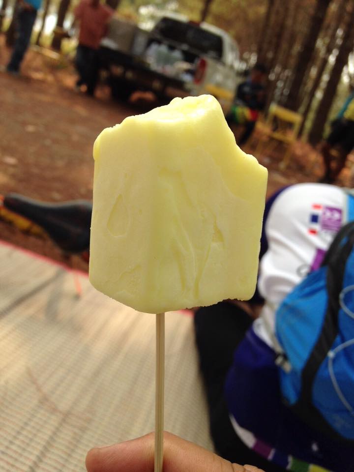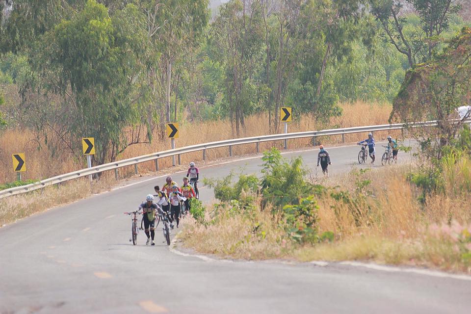 สมาชิกที่เหลือต่างก็ก้มหน้าเตรียมเผชิญชะตากรรมที่กำลังจะเกิดขึ้น เพราะข้างหน้าเป็นทางขึ้นเขาชัน 4.6 กม. อย่างที่คาดไว้พอโผล่จากทางราบมาถึงตีนเขาทุกคนต่างร้อง “โห” พร้อมๆ กัน ภาพตรงหน้ามันไม่มีเนินให้เราได้ค่อยๆ ไต่เล่นระดับขึ้นไปเลยค่ะ มันชันมว๊ากกกก ทุกคนพร้อมใจกันจูงค่ะ ท่าจูงก็คือต้องก้มหน้าดันรถขึ้นไปค่ะ ถ้าจอดพักต้องเอาเท้ารองล้อรถเอาไว้ ไม่งั้นมันจะไหลลงค่ะ แดดก็ร้อน น้ำเริ่มหมด แต่โชคยังดีที่น้องๆ ที่จุด cp3 ขับมอเตอร์ไซด์เอาน้ำมาคอยเติมให้ระหว่างทาง เราพักกันไม่รู้กี่รอบต่อกี่รอบจนน้องที่ขึ้นไปรอบนเขา ไลน์มาบอกว่า cp จะปิดแล้วนะครับ ให้รีบขึ้นมา คนที่พอปั่นได้ก็รีบปั่นไปแสตมป์ตรากันก่อน ส่วนคนที่ปั่นไม่ไหวก็ค่อยๆ จูงขึ้นมา ที่จุด cp3 มีเจ้าหน้าที่มาส่งน้ำให้ถึงที่ แถมคว้ากระติกไปเติมน้ำให้ด้วย น่ารักจริงๆ อ้อ!! มีไอติมหวานเย็นบริการด้วย เหมือนสวรรค์มาโปรด เรามาถึงจุด cp3 เมื่อเวลา 16.31 น. ไม่น่าเชื่อเราใช้เวลาเข็นรถขึ้นเขามา 2 ชั่วโมงกว่า