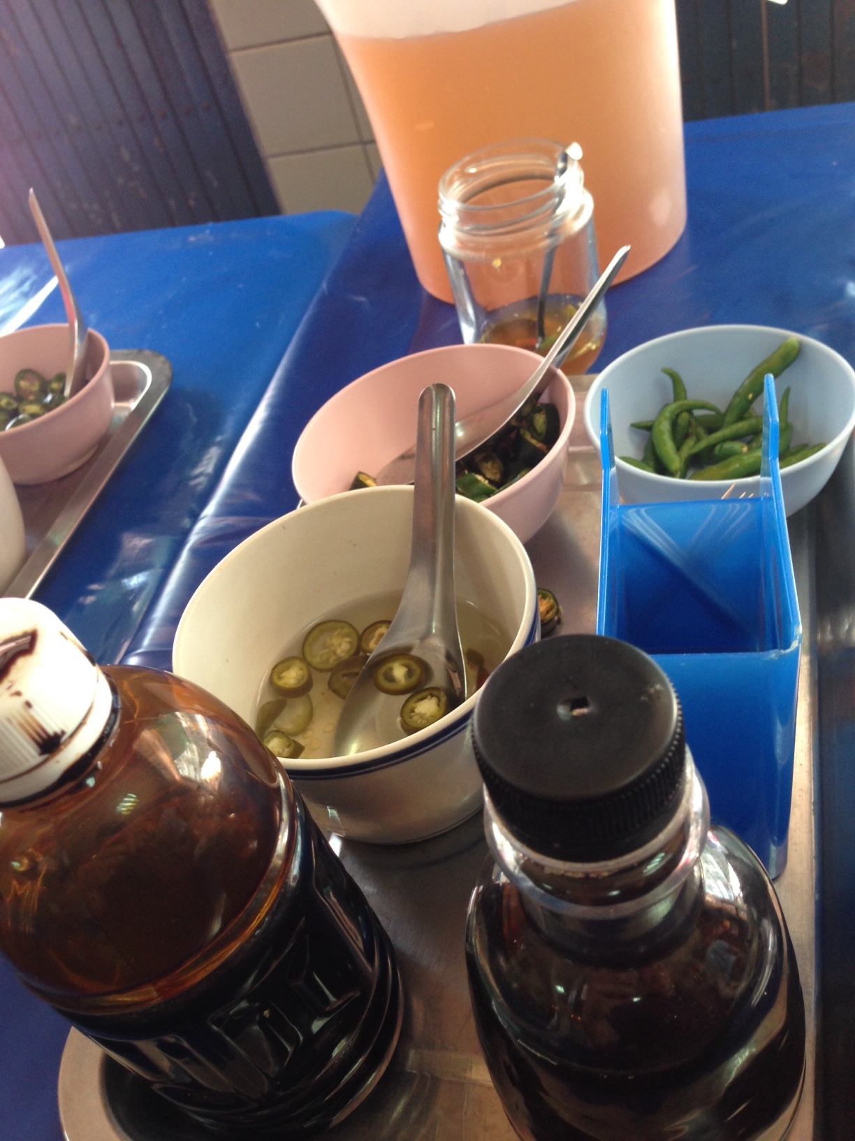 เครื่องปรุงเป็นชุดเบสิคเหมือนร้านข้าวหมูแดงเลยครับ มีซีอิ้ว น้ำปลา พริกชี้ฟ้า และพริกดองน้ำส้ม
