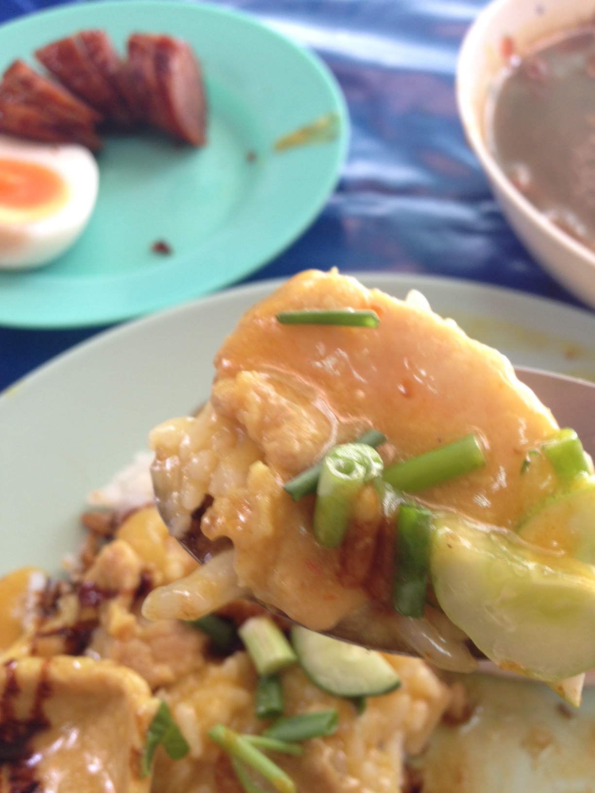 เป็นคนไม่กินเผ็ดเลยราดซีอิ้วนิดหน่อย เปรี้ยวๆเค็มๆเหมือนที่กินกับข้าวหมูแดง (ขออภัยที่ภาพเบลอเพราะหิวจนมือสั่น