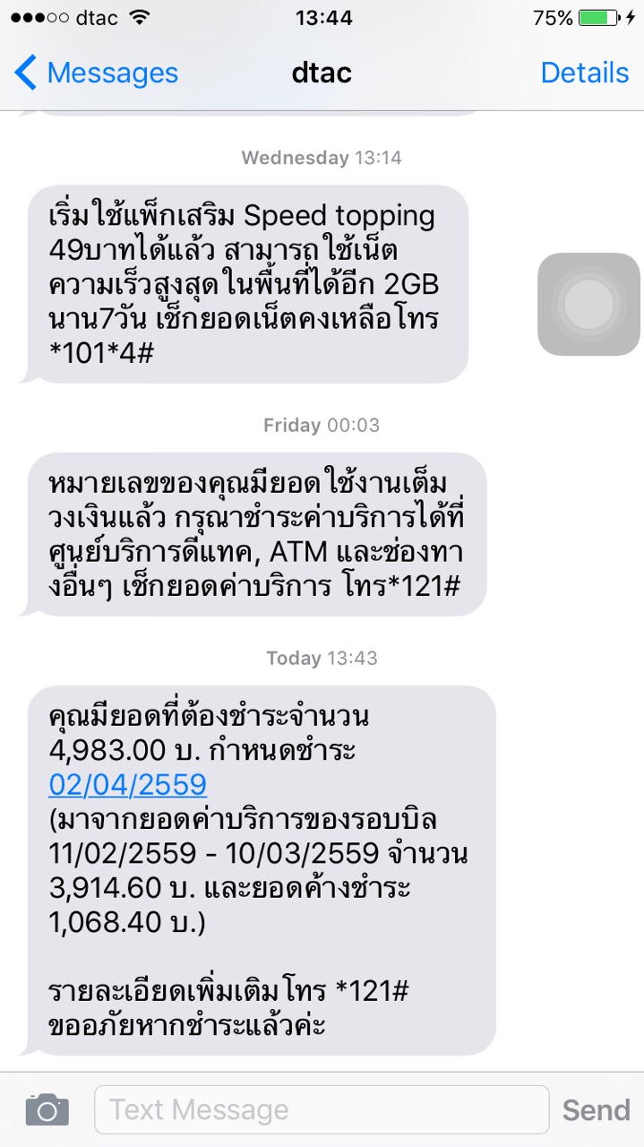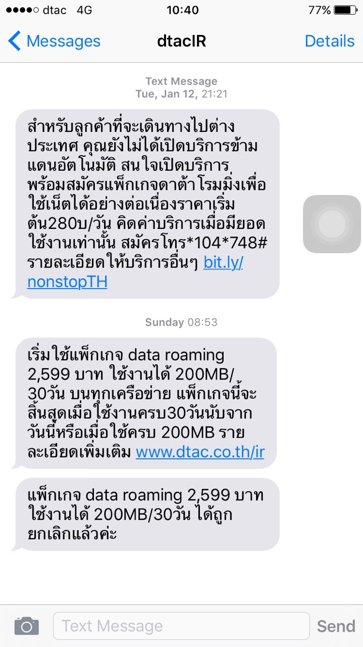 ผมบังเอิญบินไปสต๊อปที่สิงค์โปร เปิดเครื่องมากะว่าจะต่อไวไฟสนามบิน ปรากฏ sms จาก dtac สมัครแพ๊คเกจ data roaming 350บาทต่อวัน ให้อัตโนมัติเข้ามาทันที ยกเลิกก็ไม่ได้ ปราฏว่าผมเปิด data roaming ทิ้งไว้ครั
