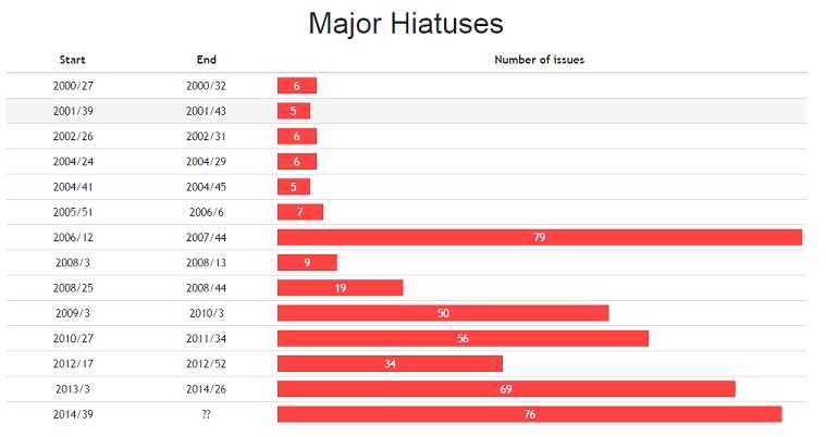 สถิติหยุดลงยาวนานที่สุดคือ "79 ฉบับ" เมื่อปี 2006-2007