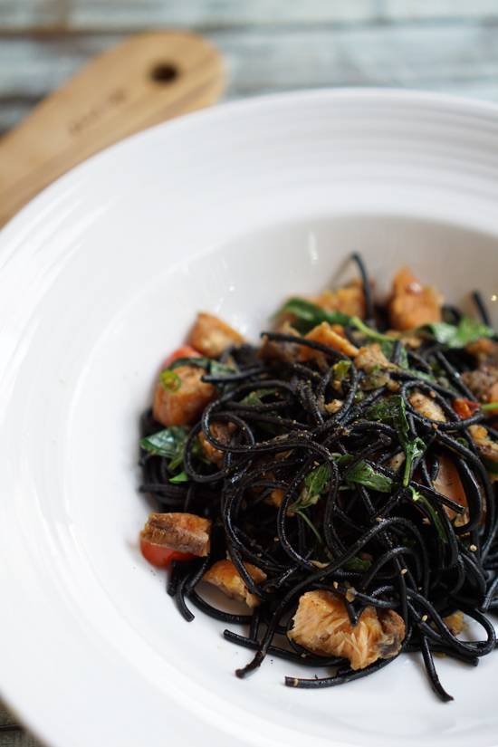 สปาเก็ตตี้เส้นดำผัดปลาแซลมอนทอด (225 บาท)