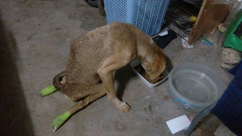 พอดีผมรับน้องหมาที่มีคนใจบุญช่วยเหลือไว้มาดูแลชั่วคราวน่ะครับ รอส่งมอบให้เจ้าของใหม่ น้องน่าจะโดนรถชนมาทำให้พิการ 2 ขาหลัง เลยเดินได้แต่ 2 ขาหน้า