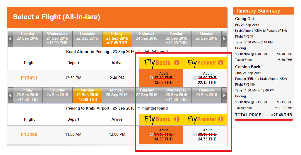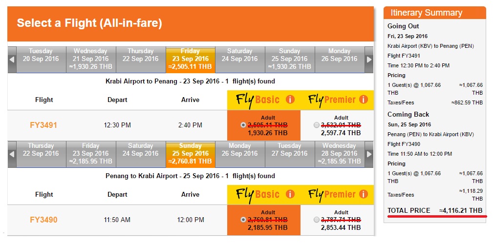 ผมเลือกช่วงปลายฝนคือ 23-26 กันยายน แต่ว่าวันจันทร์ไม่มีไฟล์ท จึงต้องเลื่อนวันกลับมาวันอาทิตย์แทน แต่เมื่อราคาแสดงขึ้นมา ผมถึงกับร้องเฮ้ย !!! คือเฮ้ยจริง ๆ นะ ทำไมไปกลับไม่ถึง 30 บาท ซึ่งทีแรกผมกะว่าจะแค่ดูเล่น ๆ ถ้าแพงก็ไม่จอง แต่คราวนี้เห็นราคาหลักสิบบาท ก็เลยกดตามขั้นตอนมาเรื่อย ๆ ก็ราคาก็ยังเป็น 27 บาท ก็เลยเอาวะ ลองกดไปจนถึงหน้าจ่ายของธนาคาร ก็เฮ้ย...แบบ ราคาเท่านี้จริง ๆ ดิ ก็เลยตัดบัตรเลย และโทรไปเช็คธนาคาร ๆก็ยืนยันว่า มีการเรียกเก็บแค่ 27 บาทจริง ๆ