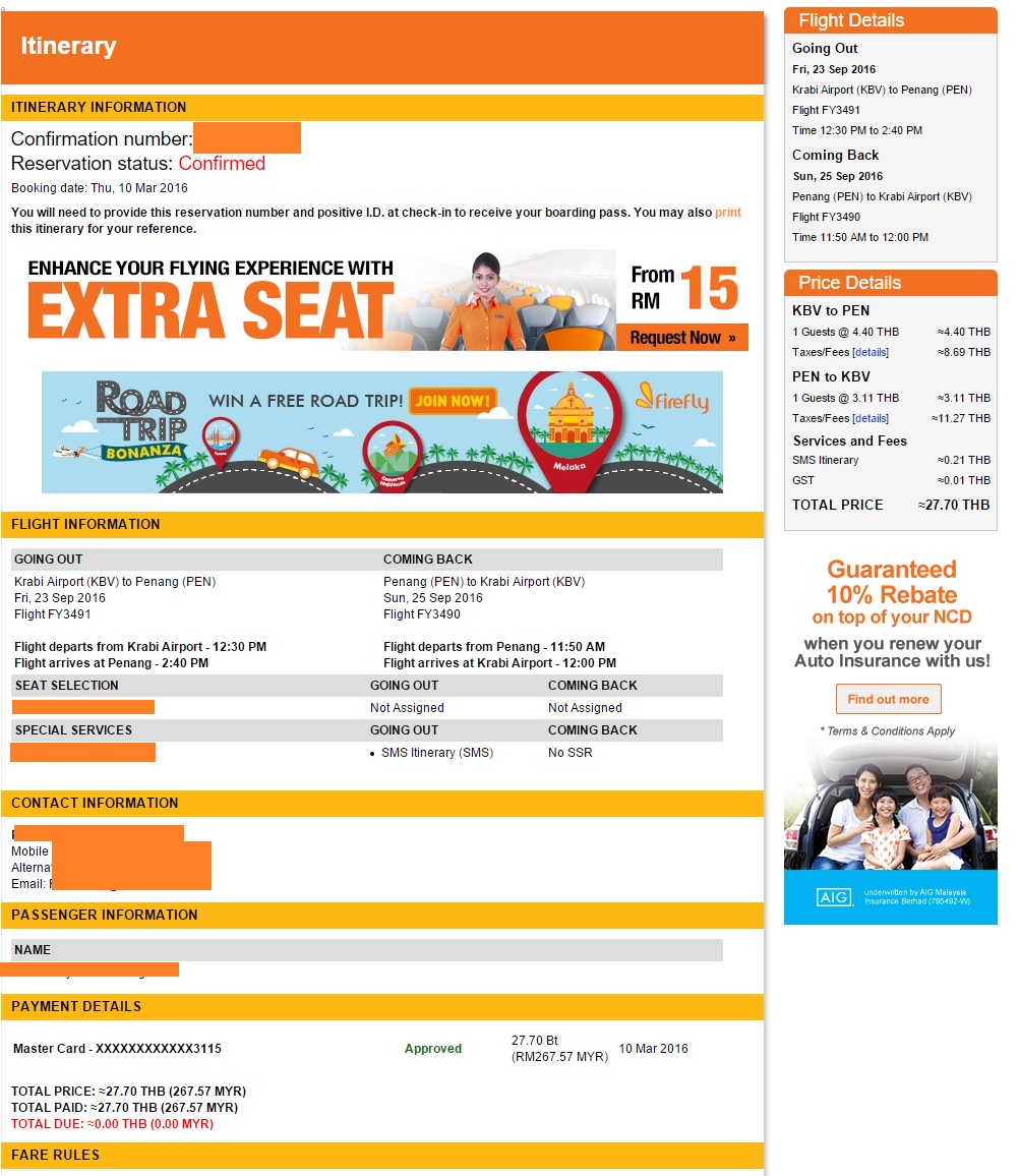 จริง ๆ แล้วถ้าสังเกตดี ๆ ผมเห็นตั้งแต่หน้าสรุปรายการจองว่า มันมีบางอย่างผิดสังเกต ก็คือต้องมีอะไรผิดพลาดแน่นอน เพราะว่าค่าเงินริงกิต ที่กำกับไว้ด้านหลัง มันไม่ถูกต้องหากแปลงเป็นเงินบาท เลยตัดสินใจส่งเมล์แจ้งไปยังสายการบิน Firefly ว่าระบบ Booking ของคุณมีปัญหาหรือเปล่า เพราะค่าเงินบาทที่แปลงแล้วมันผิด ...ซึ่งผมเองก็แจ้งไปด้วยว่า ถ้ามีอะไรที่ผิดพลาด ก็ยกเลิก Booking ผมได้ ไม่มีปัญหา(เพราะตอนนั้นอยากลองมากกว่า) ก็ส่งเมล์ไปพร้อมกับเอกสารยืนยัน ก็คือผลการจองซึ่งเป็น Confirmed แล้วด้วย