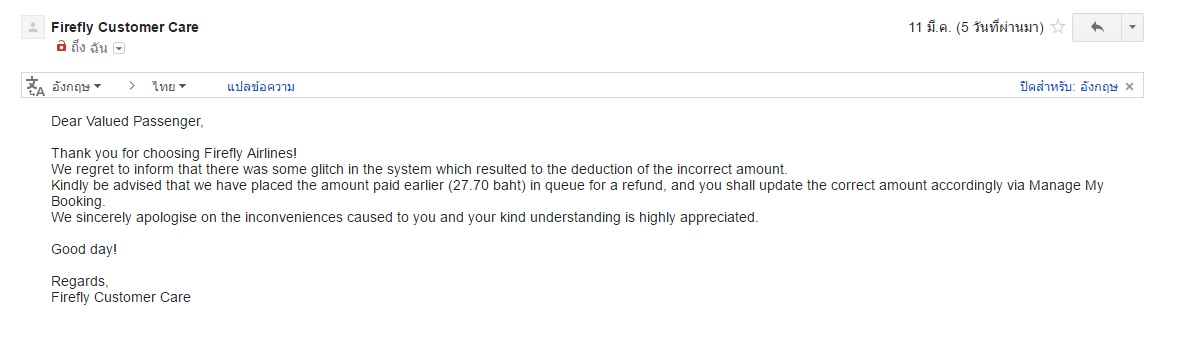 ในวันรุ่งขึ้นคือวันที่ 11 ทางสายการบิน Firefly ก็ตอบอีเมล์กลับมาพร้อมกับแจ้งว่าเกิดความผิดพลาดที่ระบบจริง โดยจะคืนเงิน 27 บาทให้ และให้ผมจ่ายส่วนต่างที่ได้แจ้งผ่านทางระบบก็คือประมาณ 2,700 บาท เข้าไป