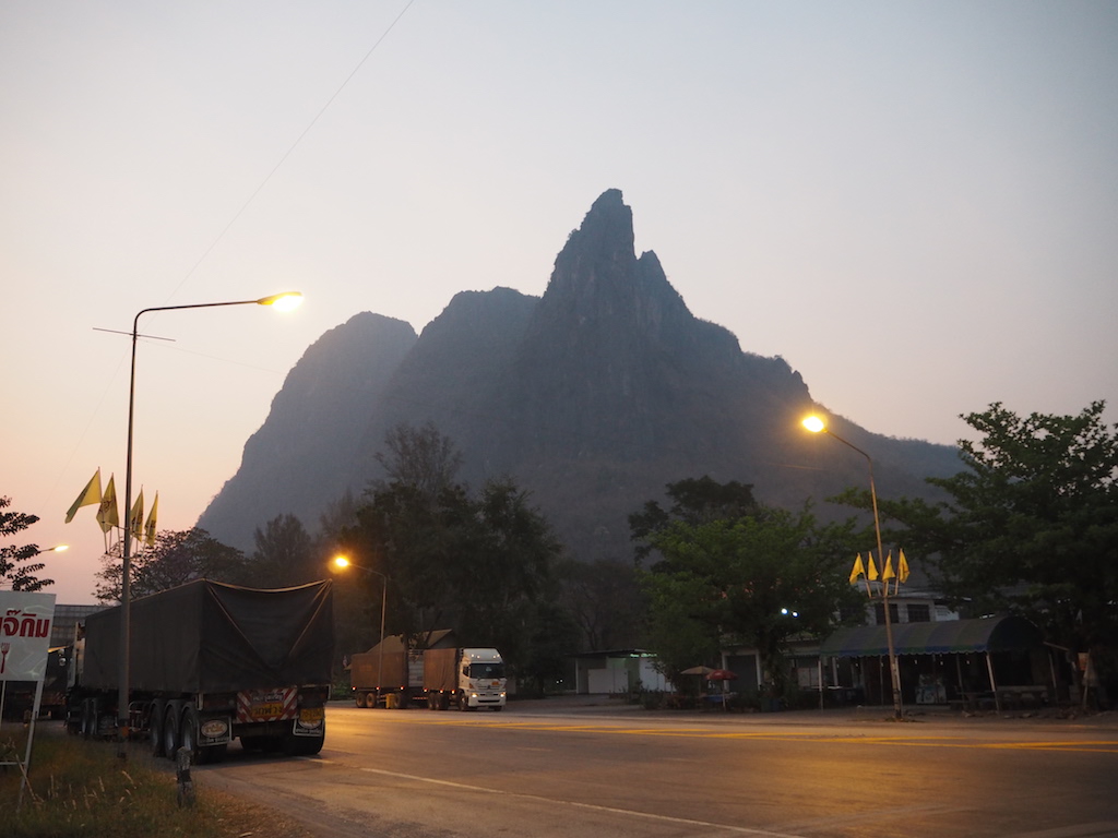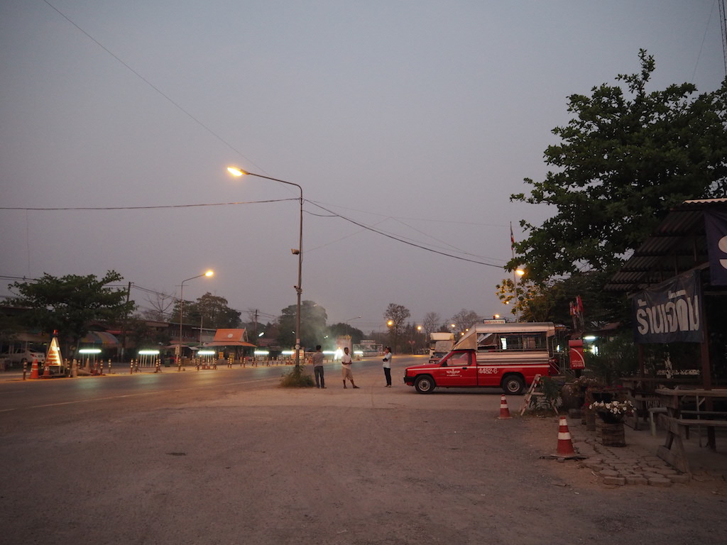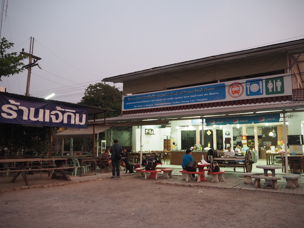 ถึงที่ผานกเค้า รถจอดตรงข้ามร้านเจ๊กิม เกือบๆ5.30 เราต้องขึ้นรถสองแถวไปที่ตีนภูที่ตรงนี้ แต่กว่าอุทยานจะเปิดให้เราเดินขึ้นก็ 7.00 เลยนั่งรอเวลา เข้าห้องน้ำ ทานข้าวเช้าเป็นข้าวราดแกงได้ที่นี่ค่ะ มีที่ขายตั๋วรถที่นี่ด้วย สามารถซื้อตั๋วขากลับตรงนี้ได้เลย สบายล่ะ หมดห่วง