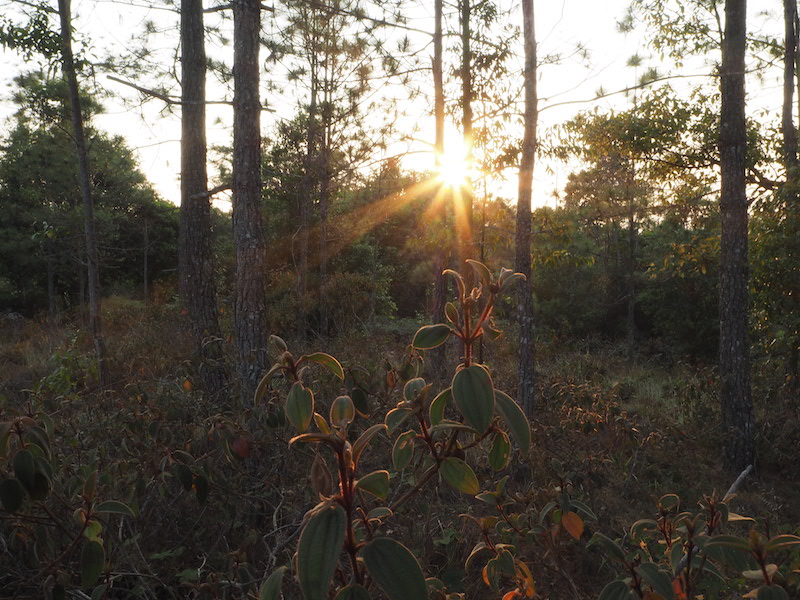 เราเริ่มเดินขึ้นตอน 7.40 ยังเช้าอยู่ อากาศก็เย็นบ้าง เดินไปซักพักก็หายเย็นละ ต้นไม้แถวข้างล่างจะผลัดใบ แห้งแล้ง เกิดไฟป่าได้ง่าย เดินไปก็ได้กลิ่นควันเรื่อยๆ ในช่วงนี้อดทนหน่อยนะคะโดยเฉพาะสาวๆ มันทั้งเหนื่อย ทั้งร้อน ทั้งกระหายน้ำ อดทนช่วงนี้ไป”เพียง” 1 กิโล ก็ถึงที่พักที่เรียกว่า ซำแฮก