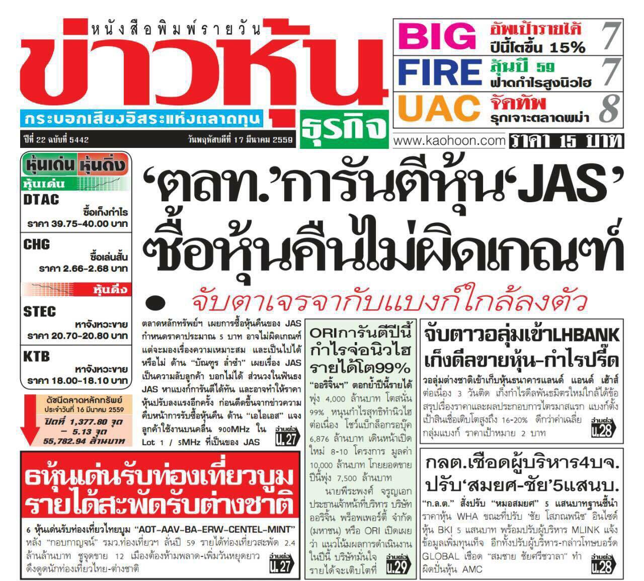 หุ้น JAS ซื้อหุ้นคืนที่ราคา 5 บาท ไม่ผิดเกณฑ์
