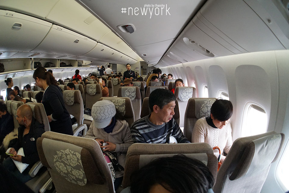 สายการบิน : รอบนี้ใช้บริการ China Eastern ค่ะ เพราะว่าตั๋วถูกสุด แล้วก็บินตรงจากเซี่ยงไฮ้รวดเดียวถึงนิวยอร์คเลยไม่เสียเวลา (ถ้าบินสายการบินนี้จาก กทม. ก็จะแวะพักเครื่องที่เซี่ยงไฮ้) ตอนแรกนึกว่าสายการบินนี้ไม่มีจอหน้าที่นั่ง เลยเตรียมอุปกรณ์เอนเตอร์เทนตัวเองไปเพียบ แต่พอขึ้นไปดีกว่าที่คิดไว้เยอะเลย มีจอหน้าที่นั่ง ส่วนที่นั่งก็สบายๆนะคะเราว่าไม่แคบ เครื่องไม่เต็มด้วย บนเครื่องเสิร์ฟอาหาร 2 มื้อละก็มีอาหารว่างอีกมื้อนึง เราขึ้นเครื่องปุ๊ปกิจกรรมหลักก็คือนอนค่ะ (เอาแรงก่อน) กะว่าพอถึงได้มีแรงเที่ยวได้เลย ไม่อยากเจ๊ทแลค 55 มีตื่นมาดื่มน้ำ เดินไปเดินมาแก้เมื่อยบ้าง
