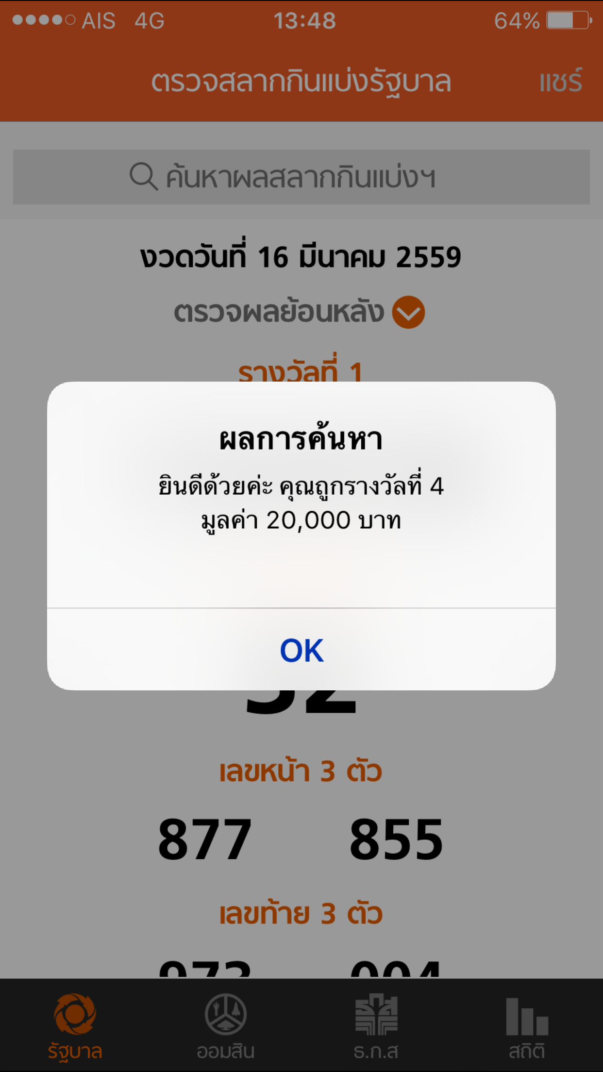 แอพตรวจผล แอพหนึ่ง ตรวจลสลากที่ถูกรางวัลที่ 4 แล้วแจ้งผลว่าไม่ถูก