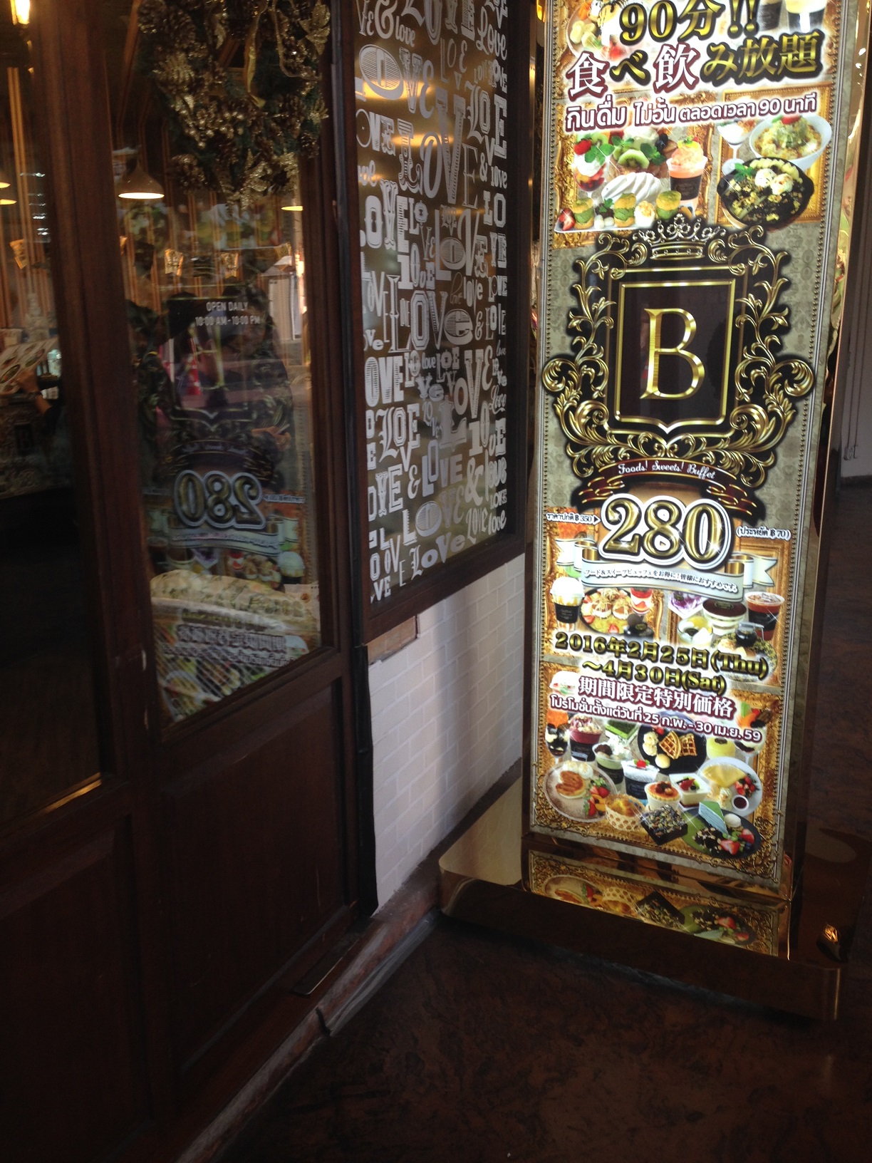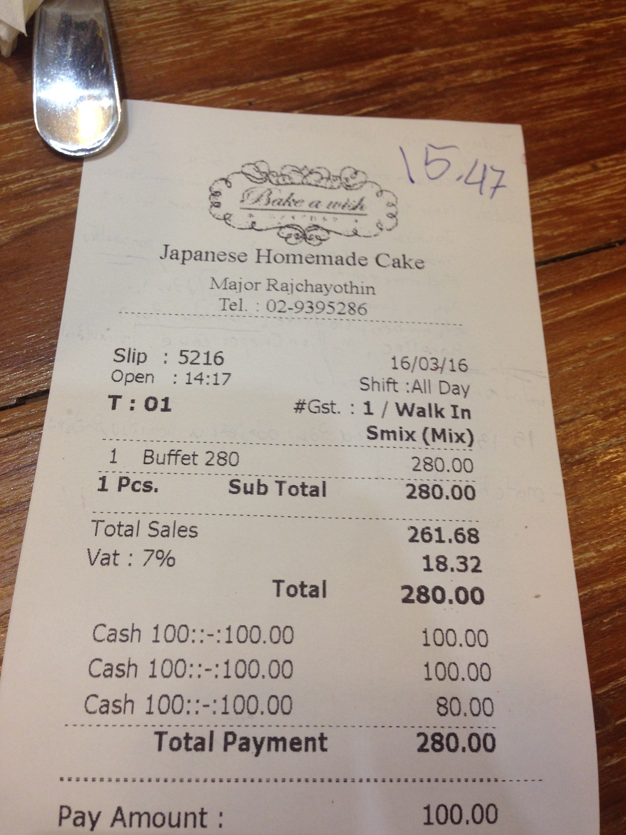 เข้าไปในร้านเดินตรงเข้าไปที่แคชเชียร์บอกเลยว่ามาทาบุฟเฟ่ต์ ซึ่งกรณีที่มาทานเป็นครั้งแรกพนักงานจะบอกกติกาต่างๆให้ฟังก่อน(ขอไม่เอ่ยในที่นี้)ทำการชำระเงินเรียบร้อยจะได้ใบเสร็จพร้อมระบุเวลามาให้ด้วย(90นาที)