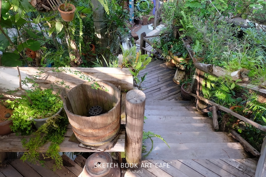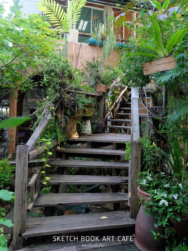 ถึงแล้ว..ว..! "Sketch Book Art Cafe'" แค่ชื่อร้านก็บ่งบอกส่วนผสมของ "ศิลปะและอาหาร" ซุ้มรั้วประตูดูเป็นงานไม้ พอก้าวข้ามไปได้ฟีลความเป็นธรรมชาติสุดๆ ทั้งโต๊ะและที่นั่งไม้ รวมถึงต้นไม้ใบเขียวนานาพันธุ์ที่โอบล้อมบ้านเล็กหลังนี้ มาเริ่มสำรวจกันดีกว่าครับ