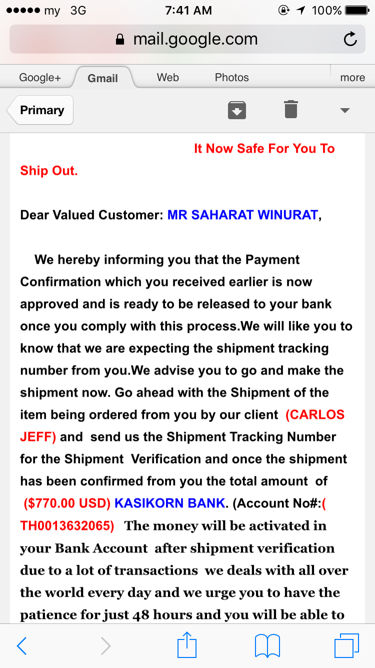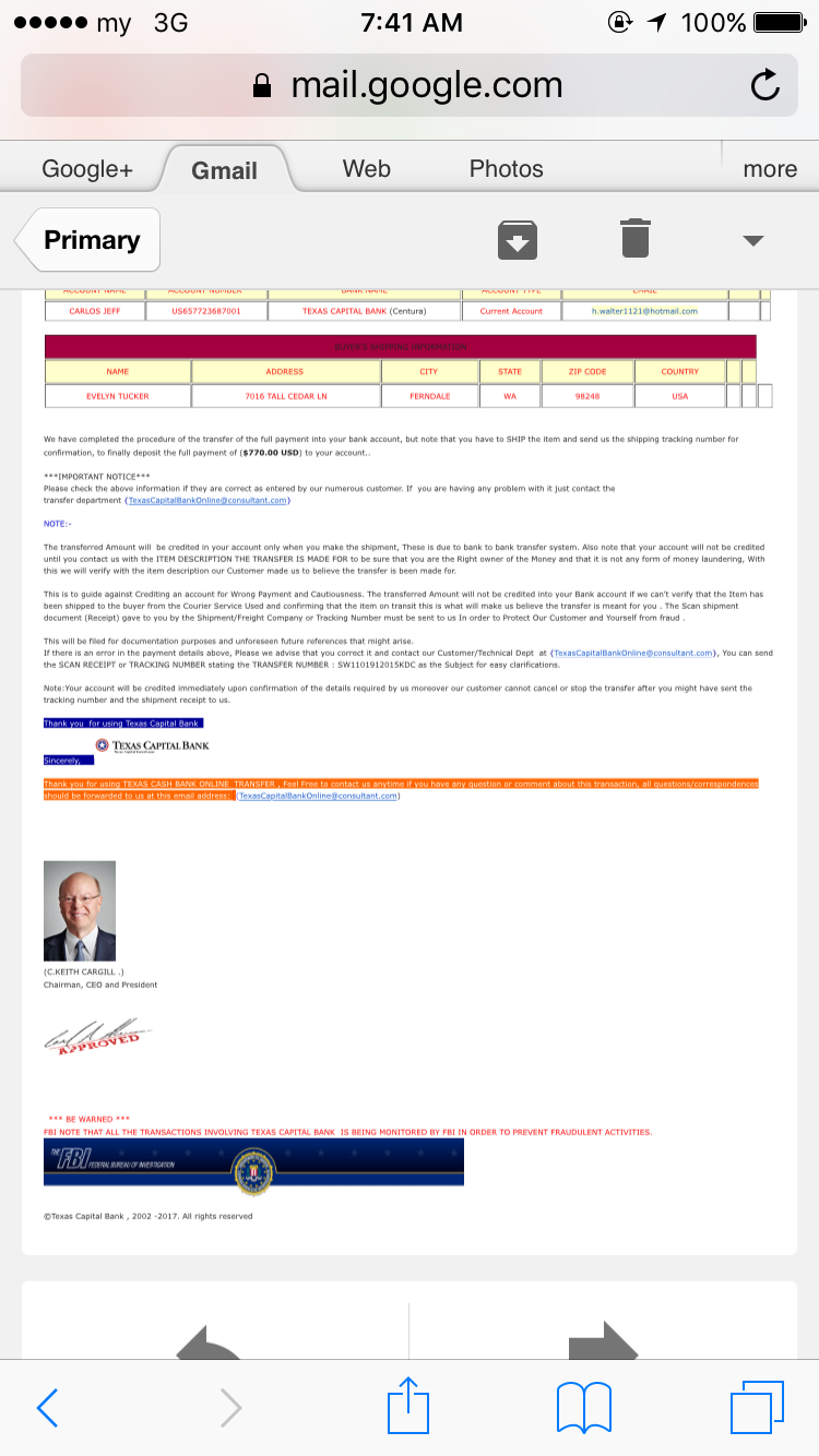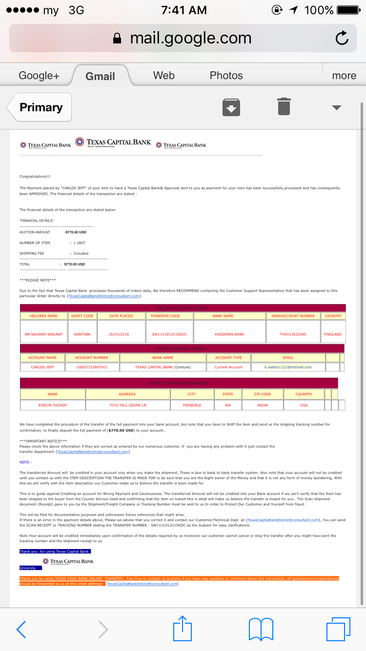 ผมได้ลงขายมือถือไว้ในเว็บแห่งหนึ่ง มีฝรั่งติดต่อมาวันสองวันมีอีเมลส่งมา จาก ธนาคารเทกซัส ผมไม่รู้ว่ามันเป็นของจริงมั้ยรบกวรใครดูเป็นแนะนำหน่อยครับ แต่ในอีเมลบอกว่าผมต้องส่งของให้ทางนั้นก่อนถึงจะ verification ยอดเงินมา