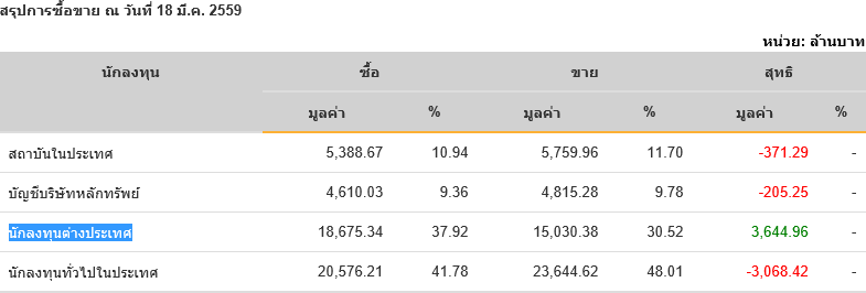 Sinthorn Summary 18/3/2559 : ต่างชาติซื้อสุทธิ 3,644.96 ลบ.