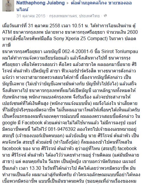 ผมได้ทำการโอนเงินจากธนาคารกสิกรไทยไปยังบัญชี santi semxci (สันติ เสมอใจ) หลังจากทำการโอนไปแล้ว meen2530ก็ทำการblockผมทันที ก็เลยมาคิดได้ว่า งานเข้าแล้วเรา เพราะตอนแรกก็ได้เอาชื่อ sirirot tonlampu และ santi semxci ตามที่meen2530 ให้มา ไปค้นหาในgoogleแล้ว ก็ไม่ปรากฎชื่อแต่อย่างใด แต่ผมดันไม่ได้เอาmeen2530 ไปค้นหาด้วย งานเลยเข้าเลย และดูเหมือนทาง meen2530 ตั้งใจเอาตัวaออกจากนามสกุลที่ส่งมาเพื่อให้ค้นหาไม่เจอ ถ้าทำการค้นหาด้วยคำว่า sirirot tonlampua ก็จะเจอชื่อและประวัติการโกงขึ้นมาทันที ชื่อเป็นภาษาไทยคือ ศิริโรจน์ ต้นลำพัว