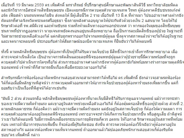"เมื่อวันที่ 19 มีนาคม 2559 ดร.เพิ่มศักดิ์ มกราภิรมย์ ที่ปรึกษาศูนย์ศึกษาและพัฒนาสันติวิธี มหาวิทยาลัยมหิดล และนักวิชาการอิสระด้านสิทธิมนุษยชน เปิดเผยกรณีการควบคุมตัวนายเจนภพ วีรพร ผู้ต้องหาคดีขับชนรถเก๋งฟอร์ด เฟียสต้า บนถนนพหลโยธิน ส่งผลให้ มีผู้เสียชีวิต 2 ราย เมื่อวันที่ 13 มี.ค.ที่ผ่านมา ไปขออำนาจศาลฝากขังผัดแรกที่ศาลจังหวัดพระนครศรีอยุธยา ซี่งภายหลังศาลอนุญาตให้ประกันตัวด้วยวงเงิน 2 แสนบาท โดยให้ไปรักษาตัวต่อที่ รพ.สมิติเวช และห้ามขับรถ รวมทั้งห้ามเดินทางออกนอกประเทศ ว่า หากมองในมุมของสิทธิมนุษยชนภาพที่ปรากฎออกมาว่า นายเจนภพยังคงนอนอยู่บนเตียงพยาบาล ถือเป็นการละเมิดสิทธิของผู้ป่วย ในฐานะที่ไม่สามารถช่วยเหลือตัวเองได้ แต่กลับถูกพรากออกไปจากแพทย์ผู้ดูแล ซึ่งดูจากสภาพแล้วน่าจะไม่ได้อยู่ในฐานะและเจตนาจะหลบหนี ประกอบกับคำให้สัมภาษณ์ของบิดานายเจนภพ ก็ยืนยันว่าไม่ได้หลบหนี"