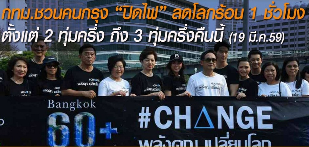 "โดยกรุงเทพมหานครร่วมกับ WWF ประเทศไทย มูลนิธิ FEED หน่วยงานภาครัฐเอกชน จัดขึ้นภายใต้แคมเปญ พลังคุณ เปลี่ยนโลก พร้อมกันนี้กทม.ขอเชิญชวนประชาชนร่วมปิดไฟดวงที่ไม่จำเป็นเป็นเวลา 1 ชั่วโมง ระหว่างเวลา 20.30 - 21.30 น. ในคืนวันเสาร์ที่ 19 มีนาคม 2559"