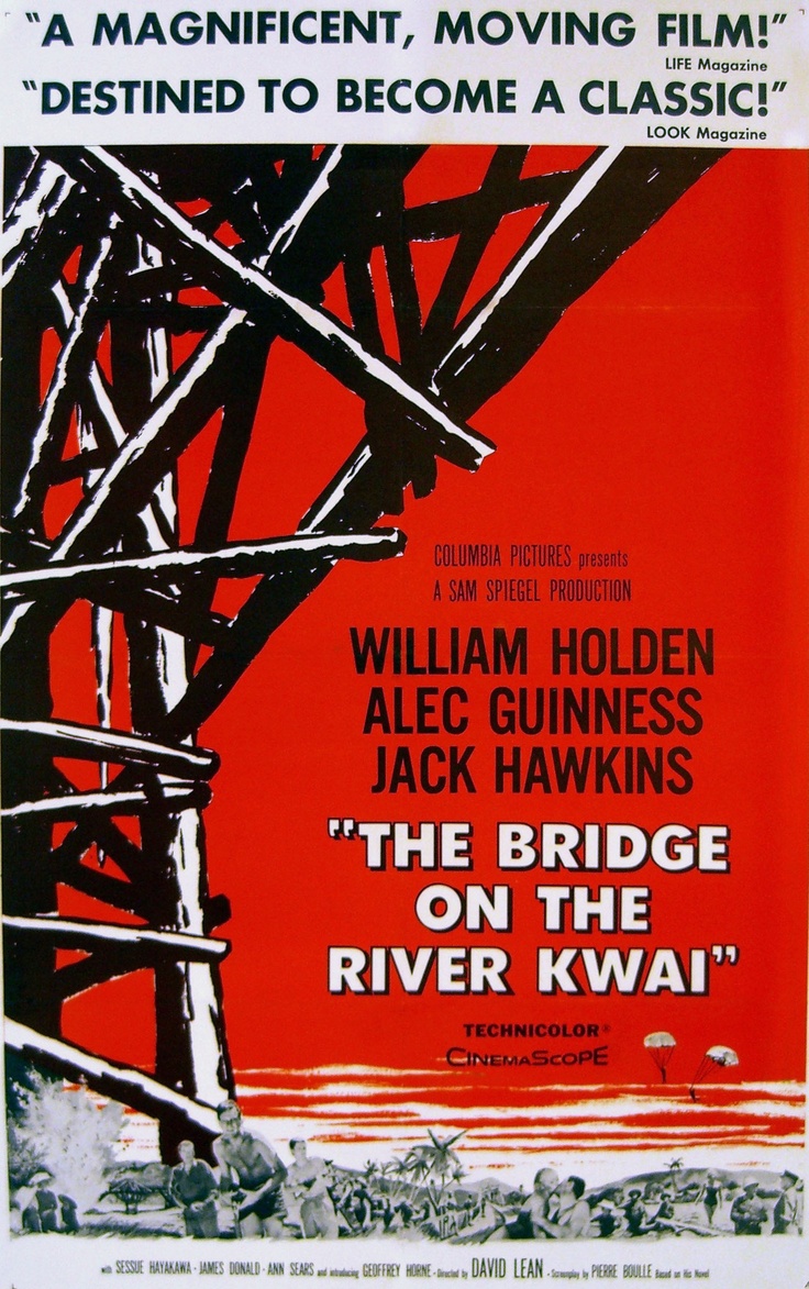 ปกติแล้วผมไม่ใช่คนที่ชื่นชอบดูหนังแบบอีพิคคลาสสิคเท่าไหร่นัก แต่กลับเรื่องนี้มีความน่าสนใจตรงที่ว่าเป็นเรื่องราวของแม่น้ำแควบ้านเราที่เหล่าทหารญี่ปุ่นมาตั้งค่ายที่นี่แล้วนำเชลยศึกทหารอังกฤษ อเมริกาทั้งหลาย มาเป็นทาสรับใช้สร้างสะพานทางรถไฟข้ามแม่น้ำให้แล้วเสร็จทันกำหนด หนังเรื่องนี้สร้างมาจากบทประพันธ์ชื่อเดียวกันของ Pierre Boulle ดารารุ่นคลาสสิคที่ผมชอบมากในเรื่องก็คืออเล็ก กวินเนส ที่รับบทเป็นผู้พันนิโคลสัน เฉือนบทเฉือนคมกับผู้พันไซโต้ ...ที่เหมือนๆจะบ้ากันทั้งคู่ที่ได้ช่วยกันสร้างสะพานนี้กันขึ้นมา อีกทั้งฝ่ายหลังยังช่วยไอ้ยุ่นในการรื้อสะพานใหม่เพราะที่เก่าตรงนั้นอาจทำให้สะพานทรุดตัวได้ งานนี้ไม่รู้เป็นแผนหลอกหรือเต็มใจอยากช่วยของนิโคลสันกันแน่ ทั้งที่เรายังเป็นเชลยศึกกับพวกญี่ปุ่นอยู่ ...ไม่รู้ว่านายพันนิโนลบ้าระเบียบการทหารมากไปหรือเปล่าเลยทำให้เป็นแบบนี้