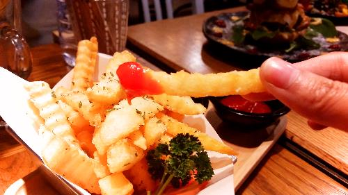 เสิร์ฟมาพร้อมกับเฟรนฟรายโรยชีส พร้อมทาทาร์ซอสเผ็ดนิดๆขึ้นจมูก และซอสมะเขือเทศ