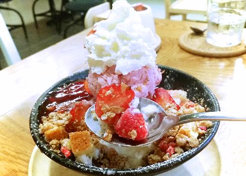 กินกับเกล็ดน้ำแข็งนมไม่หวานมาก ราดน้ำสตอเบอร์รี่ลงไปสักหน่อยกินทาน เป็นยังไงคะ ฟิน!