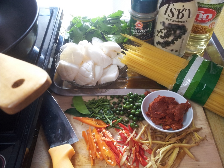 เส้นปาเก็ตตี้ / ปลาหมึก (กบเอาไปลวกก่อนพอสุกนิดๆจะได้ไม่คาว) / ใบกะเพรา / พริกชี้ฟ้าแดง + พริกแดง (เผ็ดมากเผ็ดน้อยตามใจนะค๊า) / ซอสพริกไทยดำ (กบใช้เพราะกบทานเผ็ดมากไม่ได้ เลยใช้ซอสตัวนี้มาเสริมแทนพริกเม็ดๆค่ะ )ใครทานเผ็ดใส่พริกเยอะตัดซอสนี้ออกไปก็ได้ค่ะ / พริกไทยสด / ใบมะกรูด /พริกแกง(นิดเดียวพอให้สีสวย) / กระชาย / น้ำมันพืช