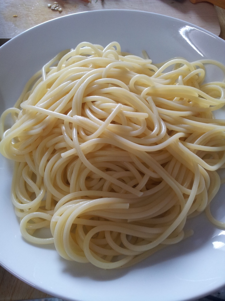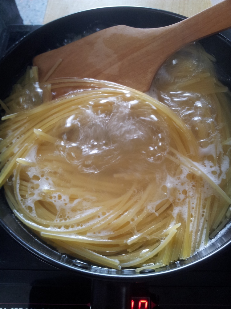 ต้มเส้นสปาเก็ตตี้แล้วพักไว้ วิธีต้ม คือ ต้มน้ำให้เดือด ใส่เกลือแค่ปลายช้อน และน้ำมันพืชนิดนึง รอจนน้ำเดือดค่อยใส่เส้นสปาเก็ตตี้ลงไปต้ม