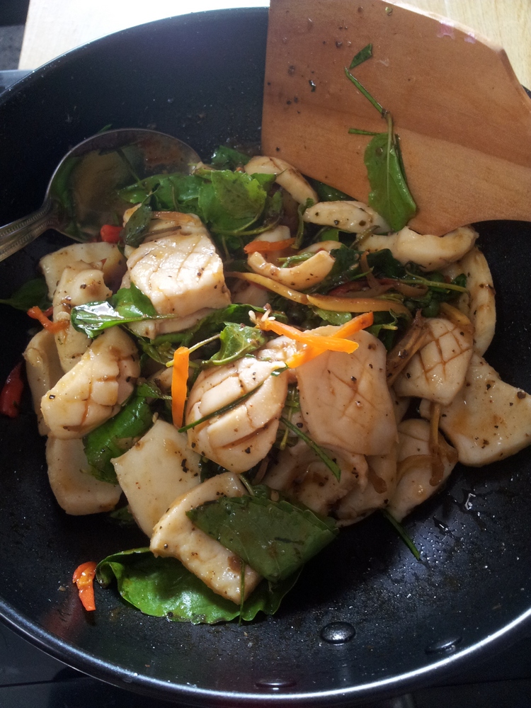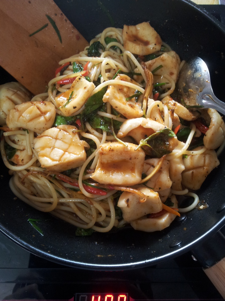 หลังจากนั้นค่อยใส่ปลาหมึก ลงไป ปรุงรสตามชอบ ( กบใช้ซอสพริกไทยดำมาเป็นตัวช่วย ไม่ต้องปรุงมาก )ใส่พริกไทยสด ใบมะกรูด เวลาผัดให้เติมน้ำลงไปนิดๆพอให้ขลุกขลิกนะคะ เพราะไม่งั้นเวลาเอาเส้นลงไปคลุก มันจะแห้งเกินไป