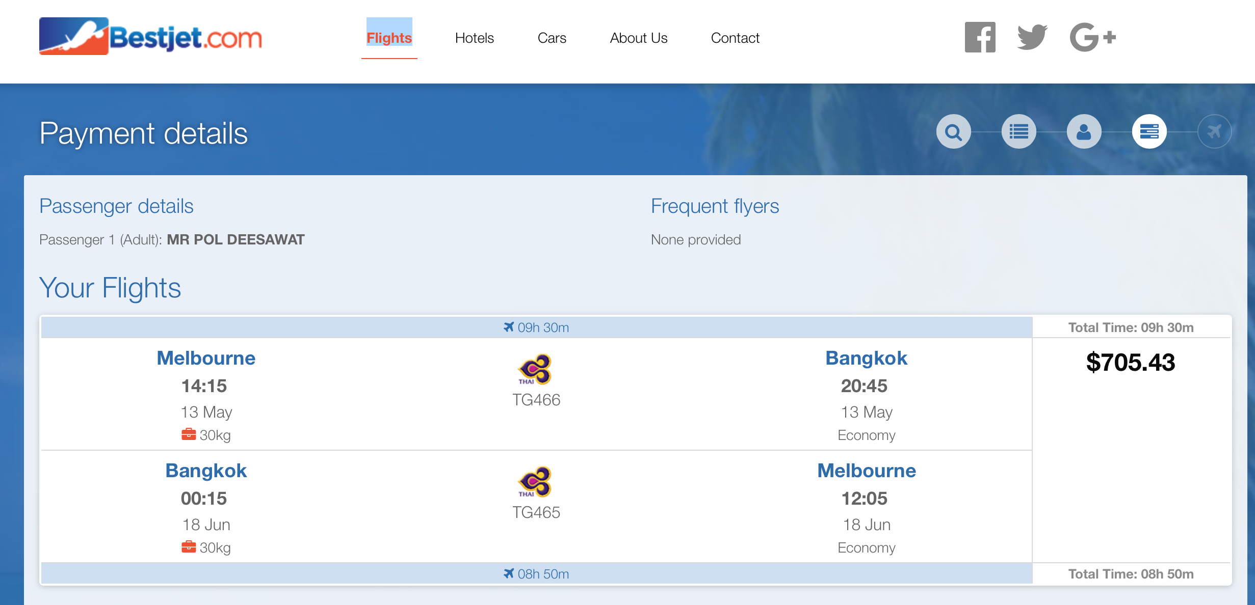 ถ้าผมซื้อตัวเที่ยวบินไปกลับจาก เมลเบิน > กรุงเทพ ของการบินไทยจากเวป Bestjet
