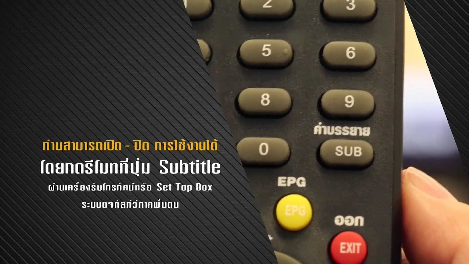 ท่านสามารถเปิด - ปิด การใช้งานได้ โดยกดรีโมทที่ปุ่ม Subtitle ผ่านเครื่องรับโทรทัศน์ หรือ set top box ระบบดิจิทัลทีวีภาคพื้นดิน