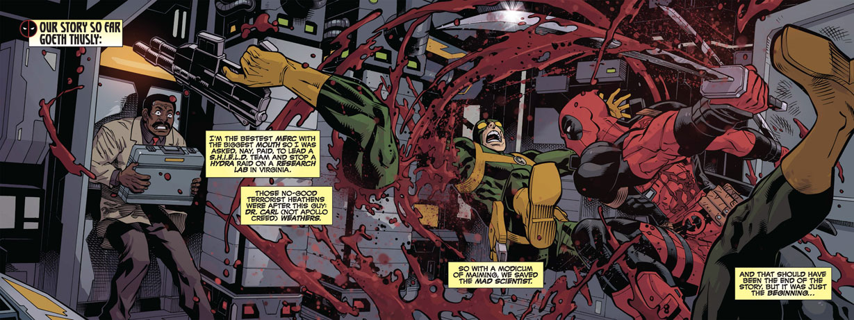 เดดพูล: ฉันคือทหารรับจ้างที่ฝีมือดีที่สุดและพูดมากที่สุด ก่อนหน้านี้หน่วยชีลด์ได้ขอให้ฉันช่วยงาน...ไม่สิ พูดแบบนั้นมันก็ไม่ถูก เอาเป็นว่าเขาจ้างให้ฉันคุมหน่วยรบของชีลด์เข้าไปหยุดไม่ให้พวกไฮดร้าบุกเข้าไปก่อการร้ายที่สถาบันวิจัยแห่งหนึ่ง