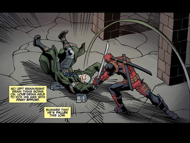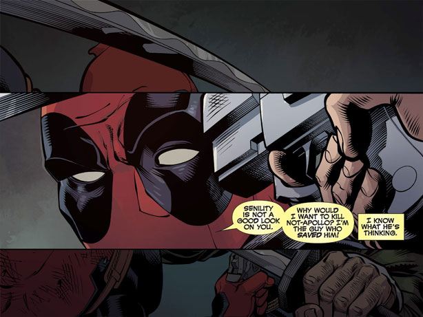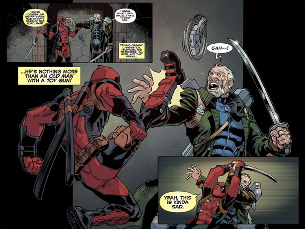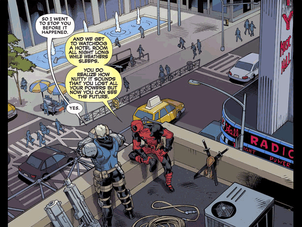 เดดพูล: เออๆ ถ้าพูดเรื่องสิ่งที่นายทำได้ในตอนนี้แล้วมันฟังดูน่าหดหู่ขนาดนั้นงั้นเดี๋ยวฉันจะพูดถึงเรื่องที่นายทำไม่ได้ให้แทนก็แล้วกัน