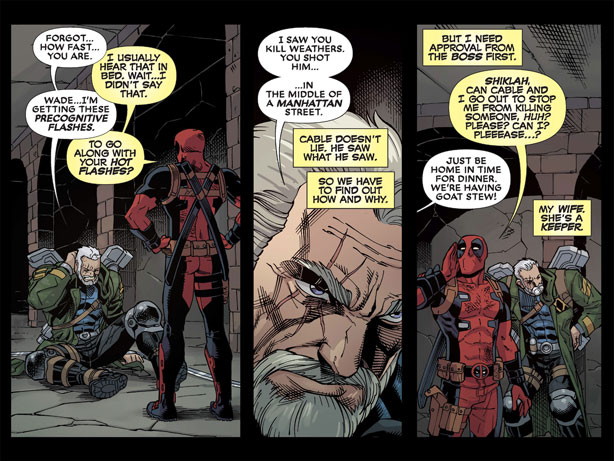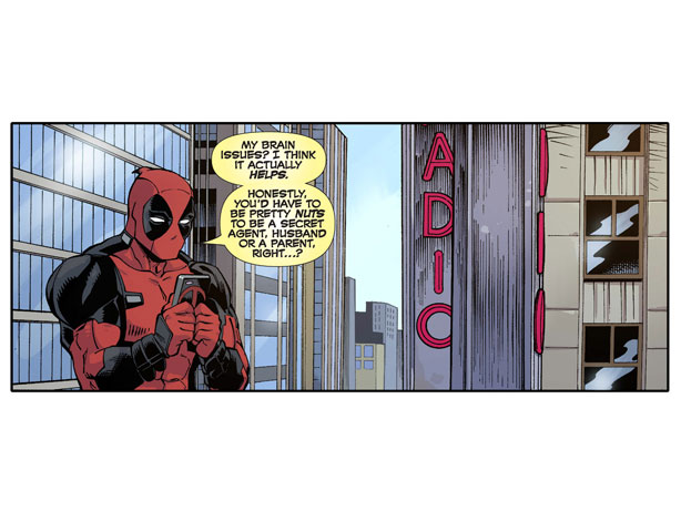 เดดพูล: อ้อ หมายถึงเรื่องที่สมองงอกตลอดเวลาจนจำเชี่ยอะไรไม่ค่อยได้นั่นน่ะเหรอ นั่นนับเป็นข้อดีซะอีก