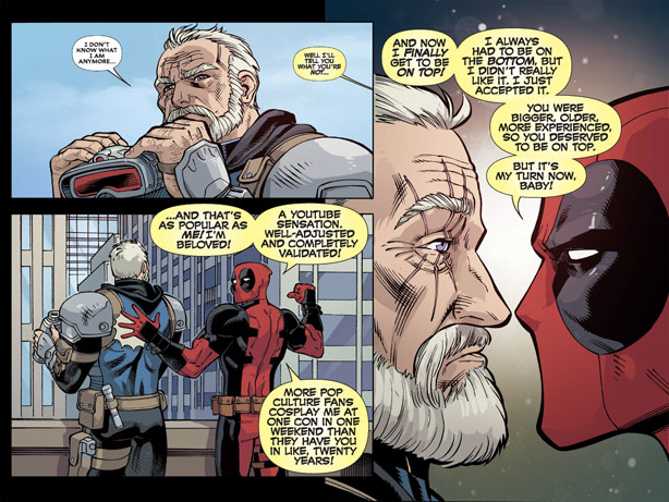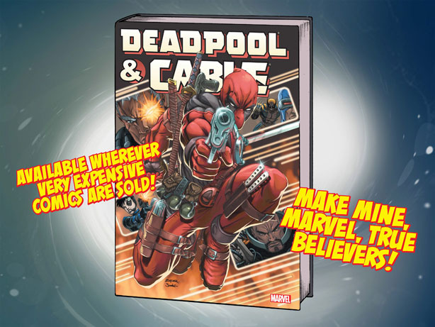 ค่ะ ดีออก มุขนี้อิพูลพูดถึงตอนขายเล่มบางๆรายสัปดาห์ซีรี่ส์ที่เล่นคู่กันมันชื่อซีรี่ส์ cable&deadpool(ชื่อเคเบิ้ลอยู่บน) แต่พอรวมเล่มหนาปกอ่อนแล้วเปลี่ยนชื่อเป็นdeadpool&cable (ชื่อเคเบิ้ลอยู่ล่าง)แล้วขายแพงๆค่ะ แต่ตอนนี้ยังไม่ออกรวมเล่มแบบปกแข็งที