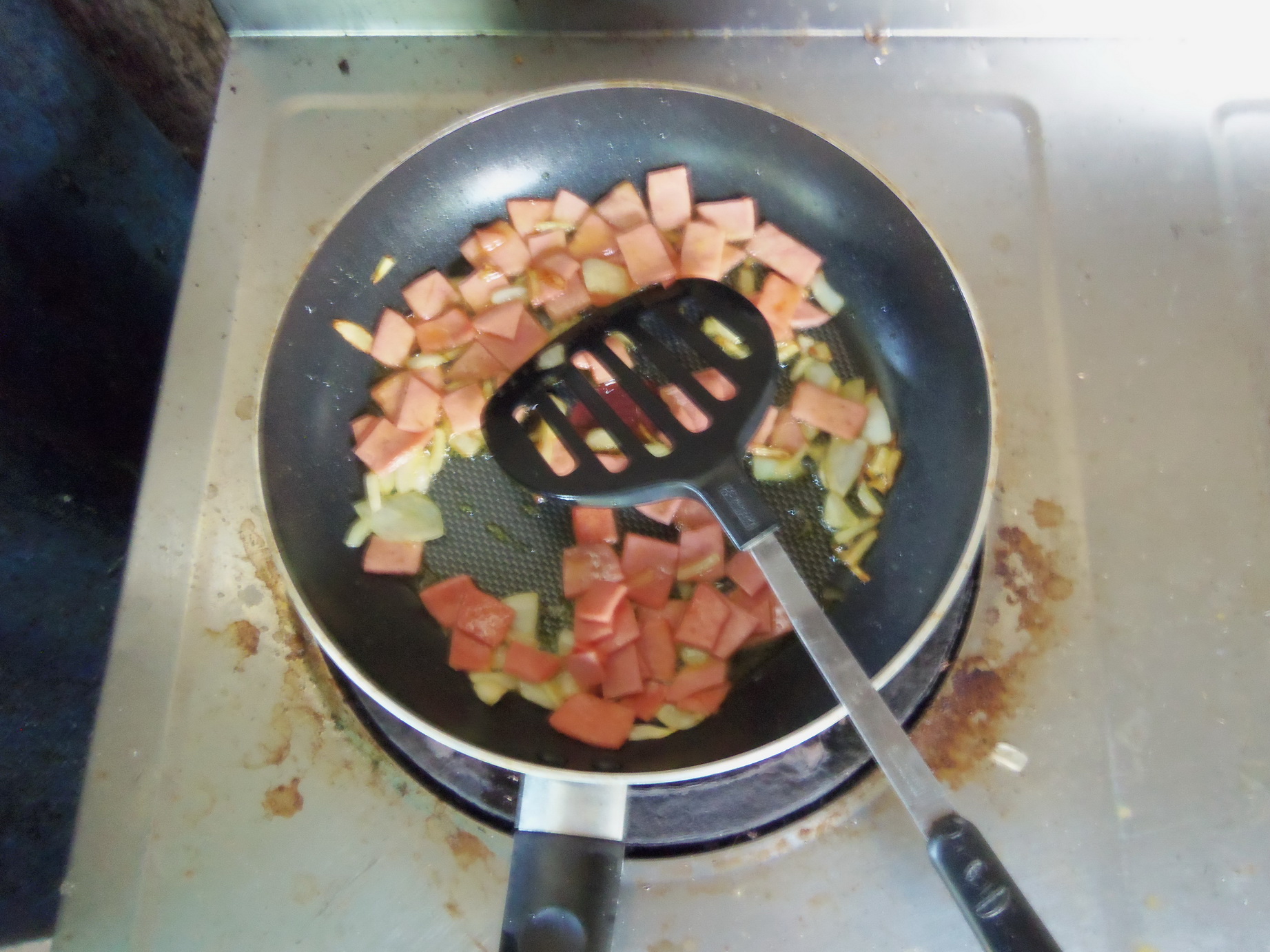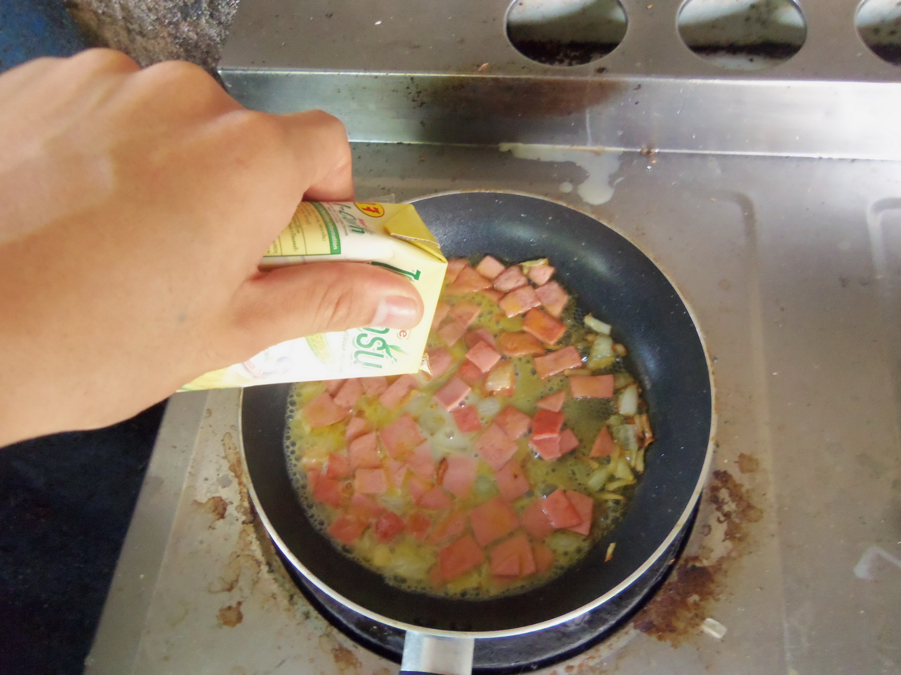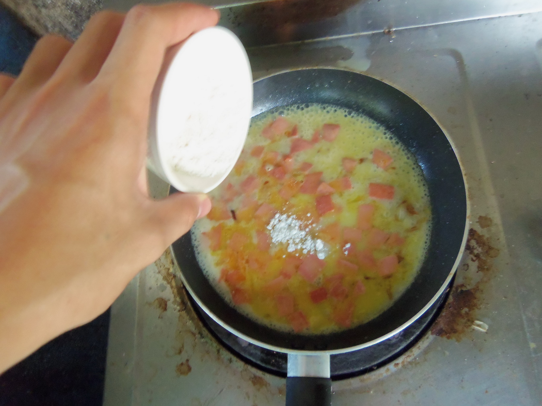 เอาละ ใส่แฮมลงไปเล้ยยย ใครจะใส่ไส้กรอกหรือเบคอนลงไปก็ตามใจเลยน้า
