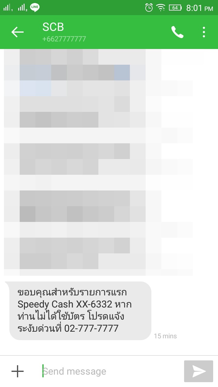 เมื่อสักครู่ที่ผ่านมาผมได้รับ SMS นี้จาก SCB แต่ว่าตัวเองไม่เคยเปิดบัตร Speedy cash ไว้