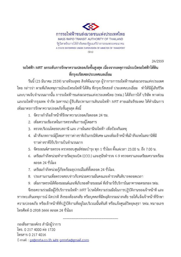 จากเหตุระเบิดกรุงบรัสเซลล์ เบลเยี่ยม !!! รถไฟฟ้าใต้ดิน"ไทย" เร่งเพิ่มมาตรการรักษาความปลอดภัยทันที