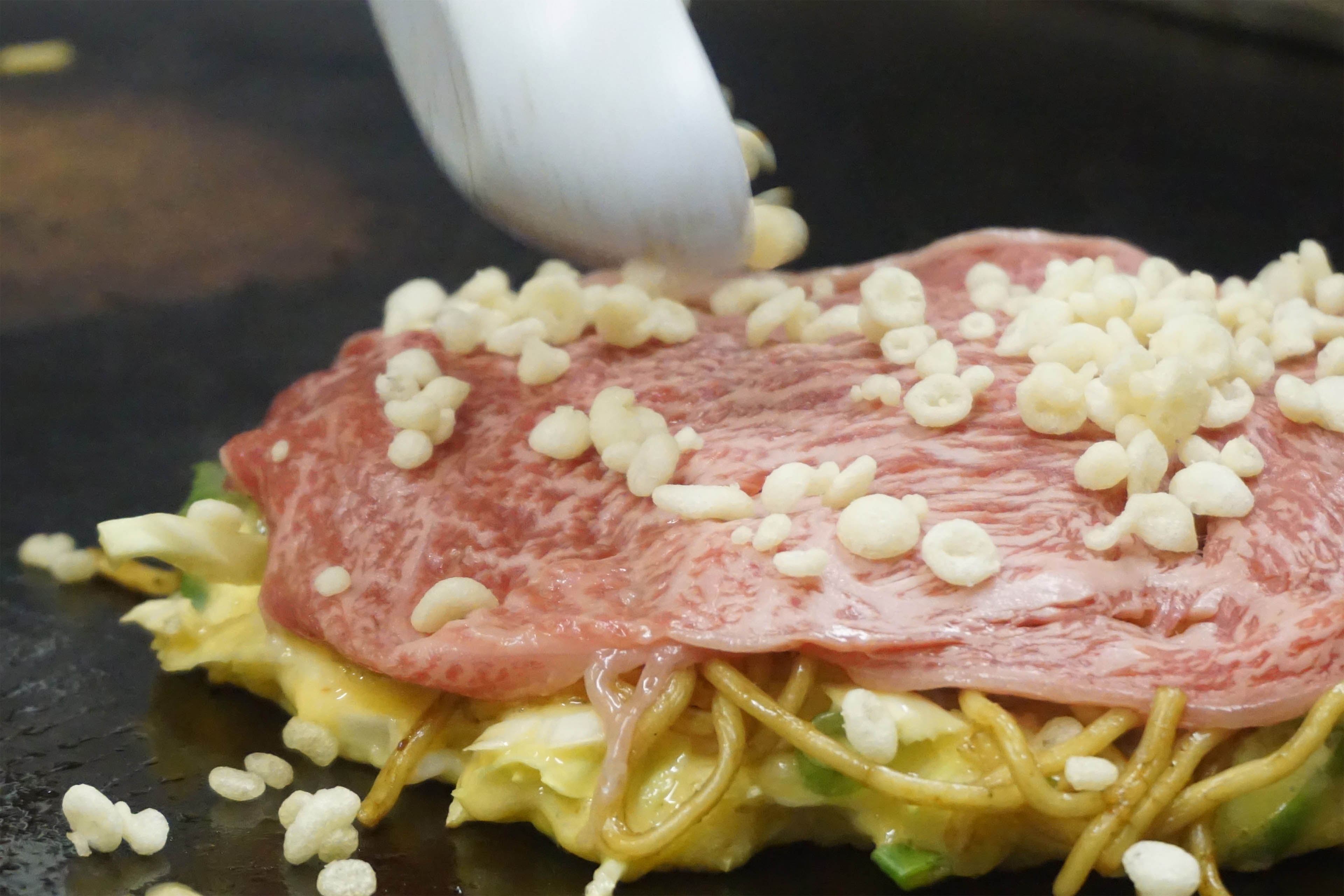 เราสั่งโมดันยากิเนื้อค่ะ ราคา 650 เยน เป็นโอโคโนมิยากิแบบมีเส้นโซบะด้วย ค่อนข้างหนักท้องทีเดียว