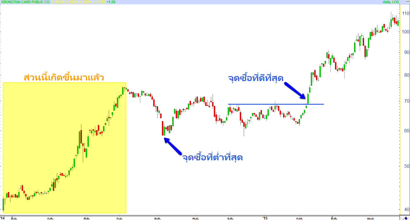 ตามภาพจะเห็นได้เลยนะครับ ถึงแม้ว่าเราจะได้ซื้อในจุดที่ต่ำที่สุดก็ตาม แต่ปรากฏว่าราคาดันเหวี่ยงออกข้างไม่ไปไหนอยู่ประมาณ3-4เดือน พอร์ตเราก็ไม่ไปไหนเหมือนกัน แต่เมื่อราคาทำNew High ก็จะเป็นสัญญาณที่ค่อนข้างชัวร์ว่าราคาของหุ้นตัวนี้จะไปต่อ หลายคนอาจสงสัยว่า แล้วทำไมไม่ซื้อตอนที่มันย่อลงมาก่อนที่มันจะเบรกขึ้นไป ทำไมต้องไปซื้อตอนที่มันเบรกขึ้นไปแล้ว แบบนี้ต้นทุนก็แพงสิ ตอบทีละคำถามนะครับ ทำไมต้องไปซื้อตอนที่ราคาเบรกขึ้นไปแล้ว? คำตอบคือ เพราะเราไม่รู้ว่ามันจะเบรกจริงๆรึเปล่า มันมีโอกาสที่จะวิ่งขึ้นไปชนแนวต้านแล้วร่วงลงเลยก็ได้หรือบางทีไม่ชนแต่ลงไปเลย การซื้อที่Breakout อาจต้องยอมมีต้นทุนที่แพงกว่าแต่ก็ชัวร์กว่า แล้วทำไมไม่ซื้อตอนที่มันย่อลงมา? ก็เพราะเราไม่รู้ว่ามันจะย่อลงไปแค่ไหน บางทีอาจร่วงหลุดแนวรับลงไปเลย หรือถ้าแนวรับรับอยู่ เราก็ไม่มีทางรู้อีกว่าเมื่อไหร่มันจะเบรก มันอาจจะsidewayไปเรื่อยๆก็ได้ การซื้อที่แนวรับ อาจทำให้เราได้ต้นทุนที่ดีกว่าคนซื้อที่เบรก แต่ต้องยอมรับว่าซื้อแล้วราคาอาจจะออกข้างไม่ไปไหนก็ได้ ก็ต้องไปรอลุ้นว่ามันจะเบรกแนวต้านขึ้นได้รึเปล่า หรือไม่ก็อาจจะพิจารณาขายที่แนวต้านไปเลย ดังนั้นจุดซื้อที่ดีคือซื้อแล้วราคาไปต่อเลยไม่ใช่ซื้อแล้วราคาsidewayออกข้าง ดูจากการที่ราคาBreakoutแนวต้านขึ้นไปได้ ราคาวิ่งไปต่อเป็นเทรนอย่างเห็นได้ชัด เข้าใจแล้วนะครับว่าทำไมจุดซื้อที่ต่ำที่สุดกับจุดซื้อที่ดีที่สุดถึงเป็นคนละจุดกัน ดังนั้นเราไม่ควรไปหาซื้อหุ้นในจุดที่ต่ำสุด แต่ไปหาซื้อในจุดที่ชัวร์และปลอดภัยจะดีกว่า เพราะเอาเข้าจริงๆ เราไม่มีทางรู้ได้เลยว่าจุดไหนคือจุดต่ำสุดของราคา ในขณะที่ราคาลงมาเรื่อยๆนั้น ไม่มีสัญญาณอะไรที่บอกว่ามันคือจุดต่ำสุด การที่จะรู้ว่าจุดต่ำสุดอยู่ที่ไหน ต้องรอให้จุดต่ำสุดมันปรากฏขึ้นมาก่อน แสดงว่าราคาหุ้นจะต้องขึ้นมาแล้ว แล้วเราค่อยหาจังหวะซื้อตามจะปลอดภัยกว่า แต่ทั้งนี้ทั้งนั้น ก็ต้องมีจุดStop Lossนะครับ