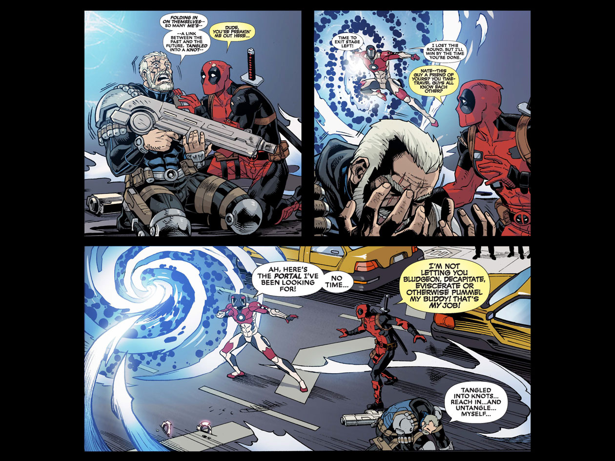 ทำให้เกิดรอยแยกของมิติเวลาขึ้น และฉัน(เดดพูล ทหารรับจ้างจอมพล่าม)กับเคเบิ้ล(ทหารจริงๆจอมขี้บ่น)ก็โดนดูดเข้าไปในนั้น