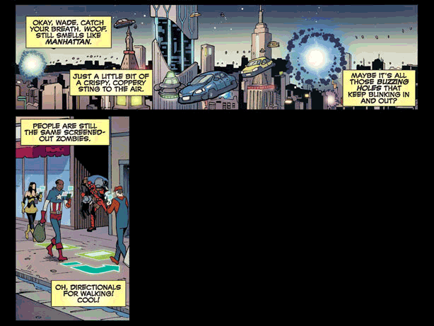 เดดพูล: เอาล่ะ เวด ตั้งสติให้ดีๆ สูดหายใจลึกๆ ซู้ด.... ที่นี่ก็ยังกลิ่นเหมือนกับเมืองแมนฮัตตั้นอยู่นะเนี่ย