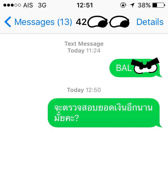 จะรู๊ดไนท์ค่ะ วันนี้อิฉันนั่งทำงานอยู่แล้วก็เผอิญอยากรู้ว่ายอดเงินในบัญชีเหลือเท่าไร แต่.... ขี้เกียจออกไปข้างนอก (ยังไม่ได้โหลดแอพออนไลน์) เลยค้นหาในลุงกูเกิล ลุงก็อธิบายวิธีส่งแบบ sms บลาๆๆๆ อิฉันก็ตัดสินใจส่ง sms ไป และแล้วก็ตามรูปเลยจ้าาา