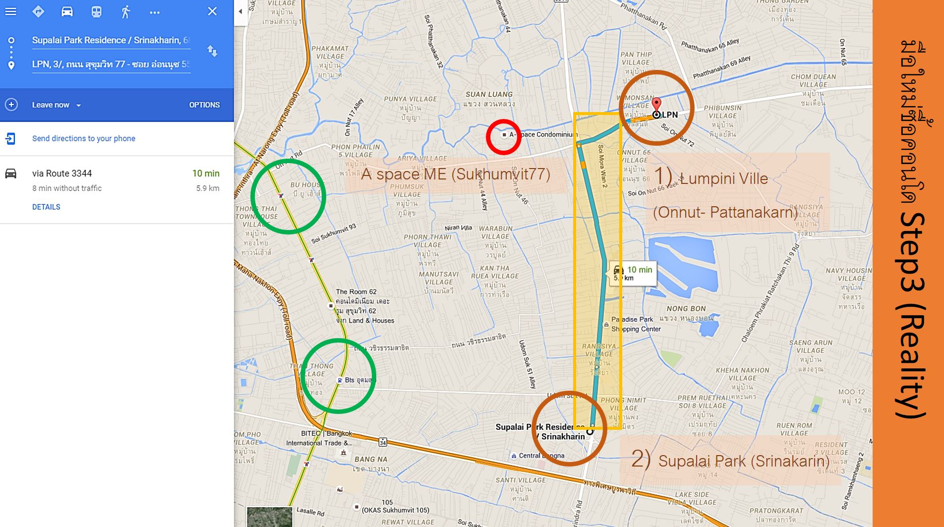 จากที่พี่ๆเห็น คือ ทั้งสองโครงการ แม้จะอยู่คนละที่ แต่ก็ไม่ได้ไกลจากกัน ก็ยึดถนนเส้นศรีนครินทร์เหมือนกัน และผมก็เอาปัจจัยเส้นทาง BTS สายสีเหลืองในอนาคตมาคิด ซึ่งตรง Lumpini Ville จะได้ในส่วนของสถานีศรีนุช ห่างประมาณ1.3Km. และ Supalai Park ศรีนครินทร์ จะห่างประมาณ 500 เมตร จากสถานี ศรีอุดม ซึ่งถือว่าใกล้มากๆ และใก้ลที่ทำงานผม คือเดินประมาณ 15 นาทีก็ถึงออฟฟิศเลย