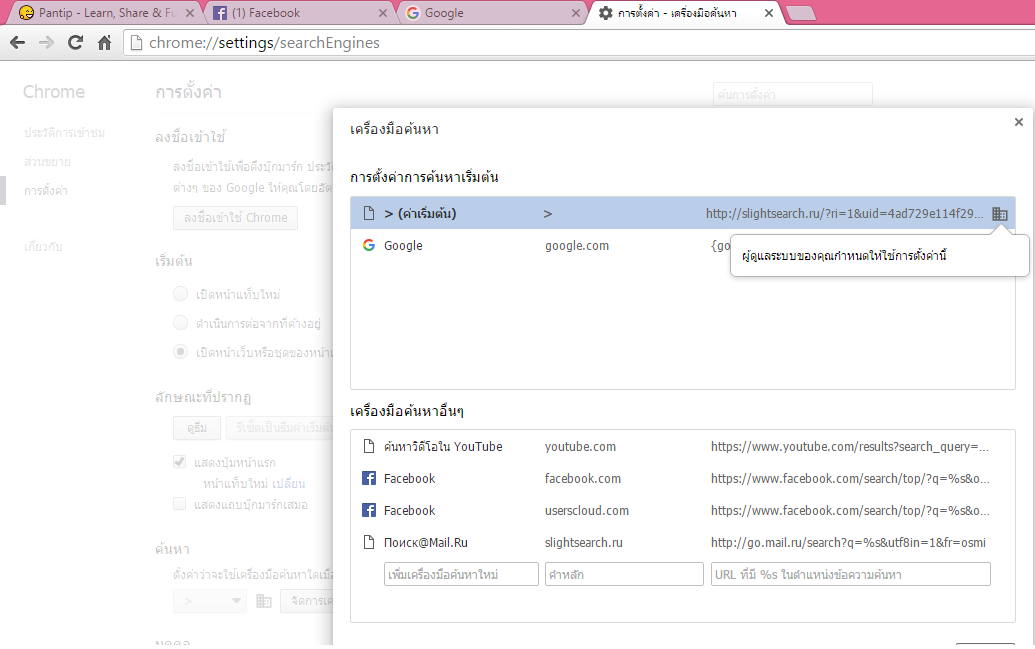 คือจะเปลี่ยนเครื่องมือ search ใน chrome แต่มันขึ้นมาแบบนี้ แก้ยังใงหรอครับ ตั้งเป็น google ไม่ได้เลย
