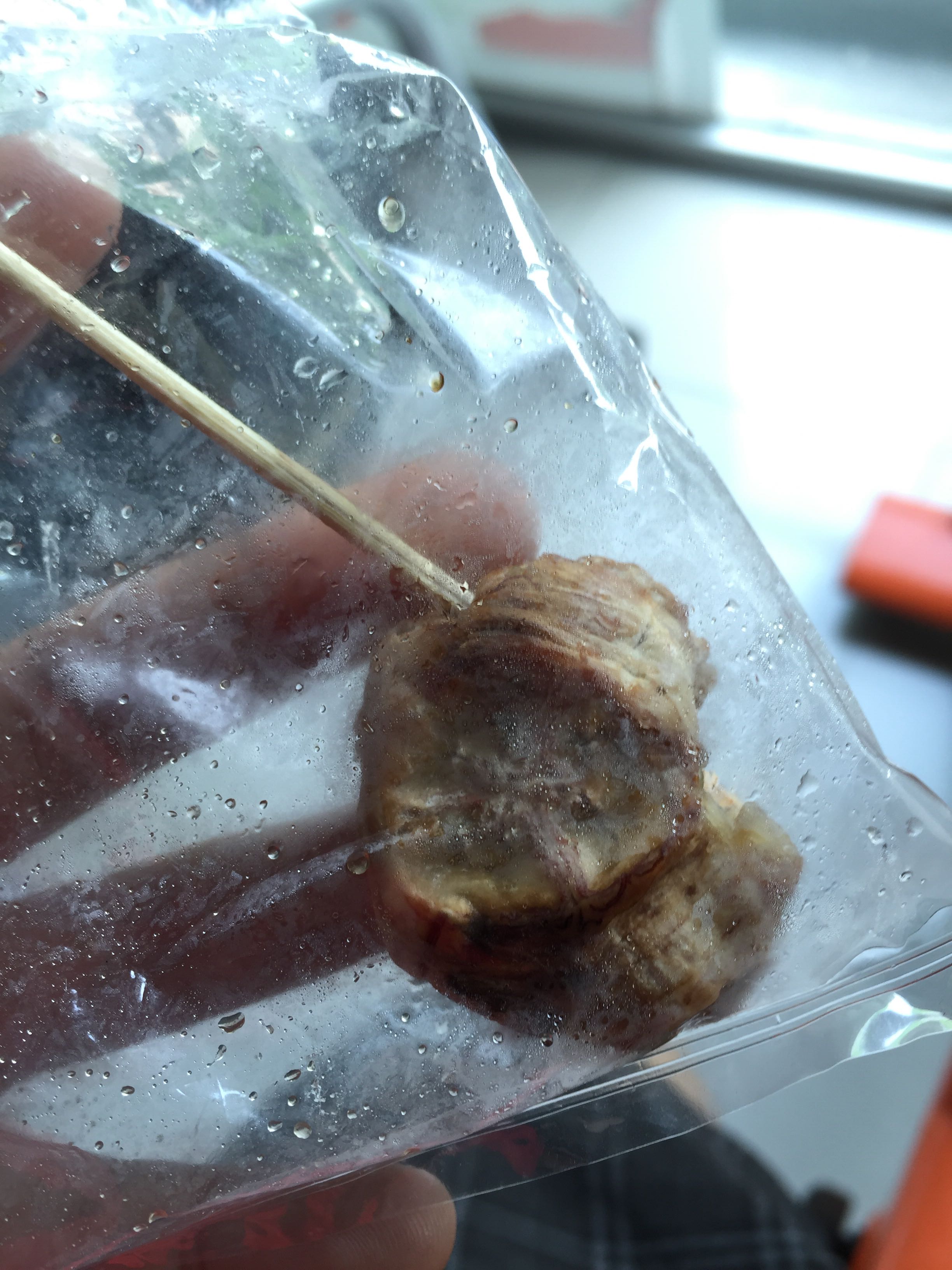 ห่อมาเหมือนห่อข้าวต้มมัด แต่ชิ้นใหญ่ ตรงส่วนสีเขียว กินแล้ว รสชาติเหมือน กินขนมข้าวต้มละวุ้นค่ะ จืด แต่ก็มีความหวานของตัวแป้ง (น่าจะเป็นข้าวเหนียว มั้งนะคะ) นิดหน่อย มีน้ำตาล กับมะพร้าว มาให้คลุกจ